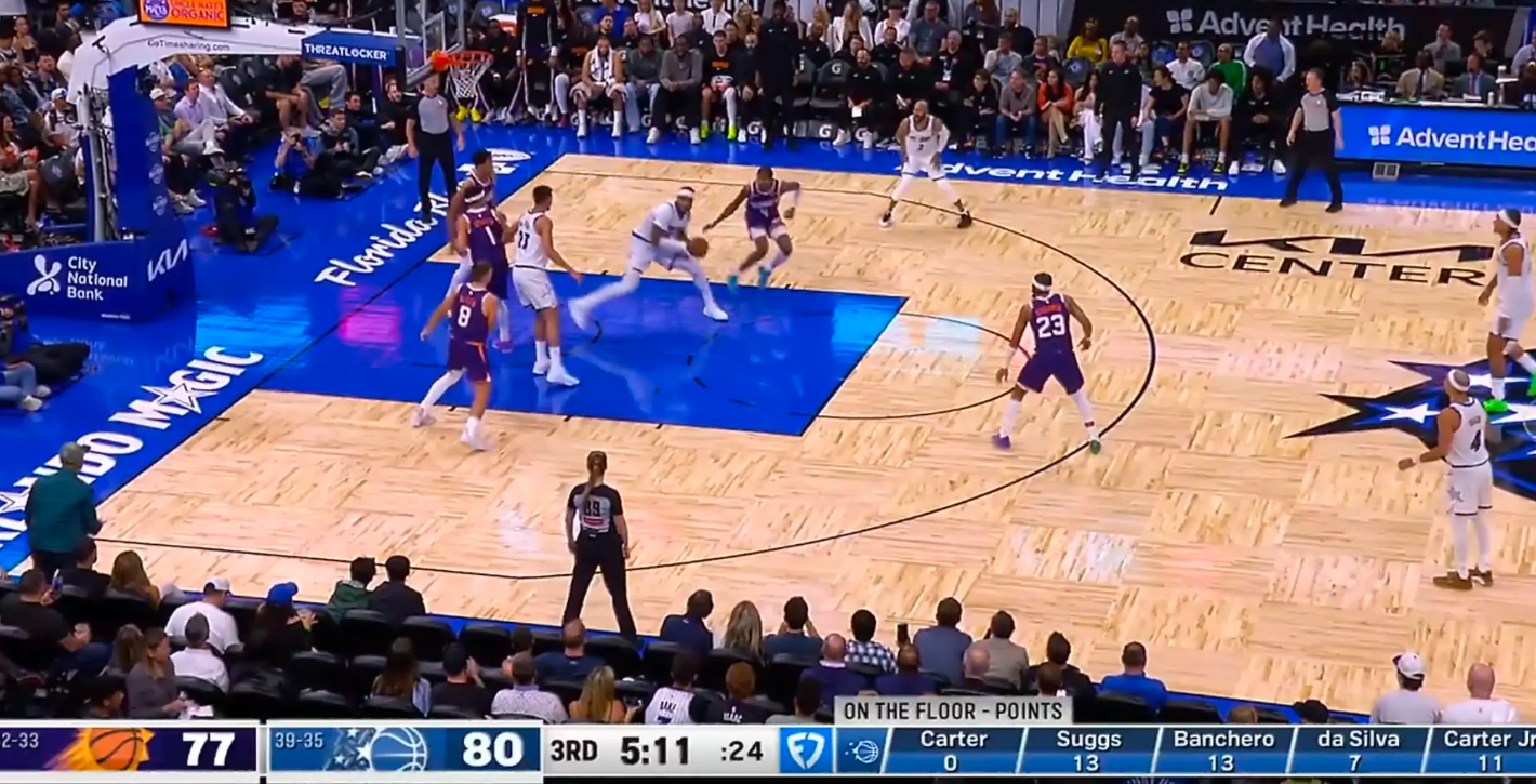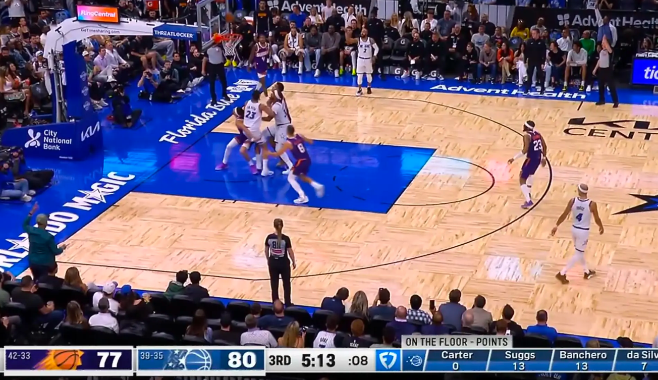 第三节结束5分16秒,落后3分,魔术进攻。格林短路,把底角的2号漏了个干净,发现的时候为时已晚,只能冲过去封盖,2号假动作虚晃,格林飞出底线。