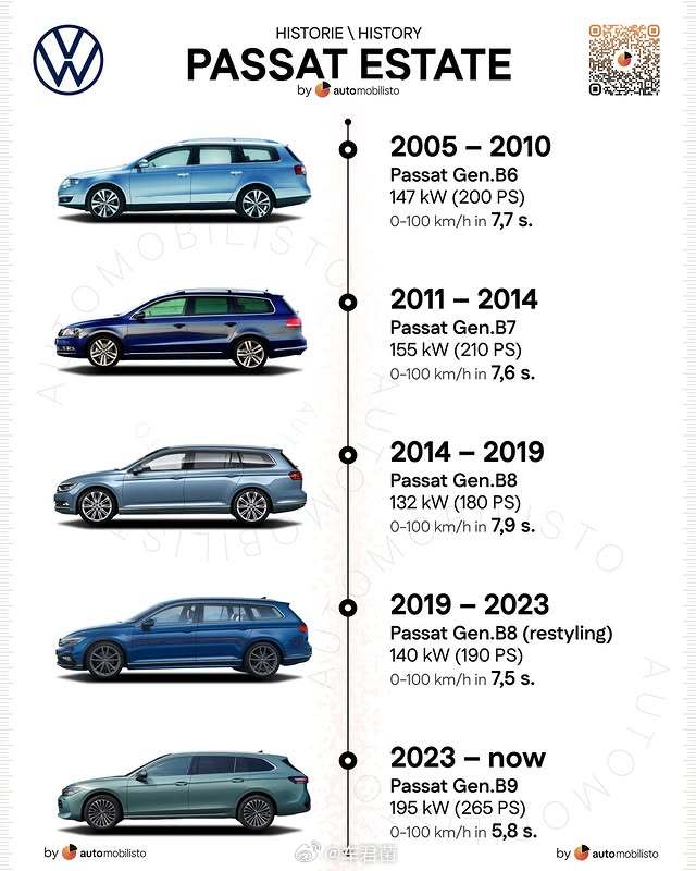 Volkswagen Passat Variant1️⃣ B1 (1973–1981) – 85 PS | 0–100 km/h: 12,6 s2️⃣ B2 (1980–1988) – 115 PS | 0–100 km/h: 10,6 s3️⃣ B3 (1988–1993) – 174 PS | 0–100 km/h: 9,4 s4️⃣ B4 (1993–1996) – 174 PS | 0–100 km/h: 9,4 s5️⃣ B5 (1996–2000) – 150 PS | 0–100 km/h: 8,7 s6️⃣ B5 Facelift (2000–2005) – 193 PS | 0–100 km/h: 7,4 s7️⃣ B6 (2005–2010) – 200 PS | 0–100 km/h: 7,7 s8️⃣ B7 (2011–2014) – 210 PS | 0–100 km/h: 7,6 s9️⃣ B8 (2014–2019) – 180 PS | 0–100 km/h: 7,9 s🔟 B8 Facelift (2019–2023) – 190 PS | 0–100 km/h: 7,5 s1️⃣1️⃣ B9 (seit 2023) – 265 PS | 0–100 km/h: 5,8 s