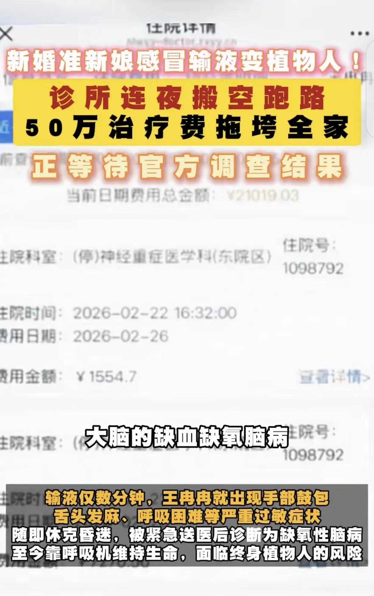 山东泰安,一24岁准新娘,还有2个月结婚,因轻微感冒,就去诊所看病,接诊医生没测体温,没做皮试,只简单问了几句,就给她输液,万万没想到只几分钟,女子就手鼓包,舌头发麻,喘不上气,很快休克昏迷,被确诊缺氧性脑病,有可能成为植物人,诊所一看大事不好,连夜搬空跑路,女子治病已经花了50多万,后面的治疗费还是无底洞,家人直接崩溃了! 王冉冉今年24岁,刚领了结婚证。小两口正忙着看酒店、挑婚纱,一月底她突然有点感冒,想着赶紧治好别耽误事,就去了家附近的“锦医堂诊所”。 她本想输个液好得快,当时诊所医生就问了问,也没做皮试,输液针就扎上了。几分钟后手背鼓起一个大包。她感觉舌头麻了,想说话却喘不上气,眼前一黑就什么都不知道了。 送到齐鲁医院时她的脑子因为缺氧受到了毁灭性损伤,医生说醒过来的希望很渺茫,未来很可能是植物人状态。喜帖还没发,婚纱还没试,她的人生剧本,在诊所的椅子上被彻底改写了。 人是救回来了,可是一直都没有醒过来,诊所一开始付了部分费用,负责人也去自首了。可没多久诊所的设备搬空了,人也跑得无影无踪。电话打不通大门紧锁,只留下一个被搬空的店面。 她已经在ICU躺了快三个月了,丈夫小张天天守在门外,家里积蓄早掏空了,还欠下一大堆债。他说不敢想未来,只能盯着今天的账单,医院催费单一张接一张。 很多人问为什么不做皮试?这里有个要命的认知盲区。现在很多抗生素,比如头孢,指南确实不强制要求皮试了。可这不代表医生就能高枕无忧! 医生在问诊时应该反复确认“你以前对什么药过敏吗”?输液时也要护士多观察,诊所里更要常备救命用的肾上腺素。王冉冉遇到的诊所,是把“不强制皮试”当成了“无需负责”的借口,把关键的安全步骤全省了。 有的诊所本质上是个“有限责任个体户”,出了天大的事,老板就一跑了之。我们身边有多少这样的“便利诊所”?看着挺亮堂,可它的抢救设备够吗?医生面对急症手会不会抖?它有没有应对“万一”的能力和良心?这次悲剧告诉我们,那个“万一”,就是百分之百的毁灭。 一场感冒,掏空一个家,毁掉一段人生,这代价太重了。选择医疗机构,别只看距离近、价格低,它的应急能力和医者良心,才是真正的“价格标签”。 希望王冉冉能等来奇迹。也希望这样的悲剧,能敲醒某些人的麻木,筑牢我们每个人求医问药时,那道最基本的安全防线。 各位读者你们怎么看?欢迎在评论区讨论。 消息来源:法治进行时
