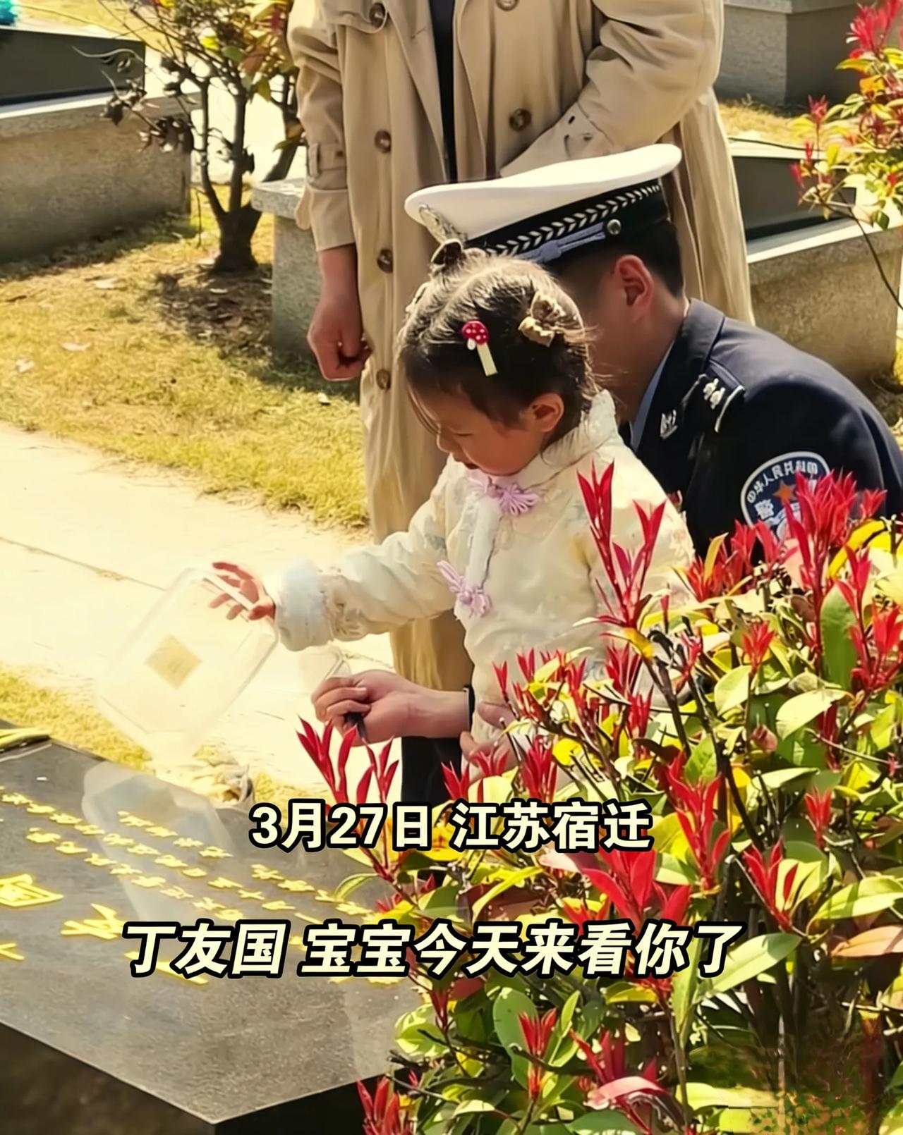 3岁孙女初见29岁爷爷,一束白菊一碗饺子看哭全网 2026年3月27日,清明前夕,江苏泗阳爱园烈士陵园里,3岁的丁宝攥着一束洁白的菊花,小手里还紧紧抱着一个搪瓷饭盒,迈着晃晃悠悠的小步子,第一次来“见”她的爷爷。可谁能想到,照片里的爷爷,永远停在了29岁,比养大丁宝的爸爸还要年轻,这一场跨越27年的祖孙相见,刚一开始,就让无数人瞬间破防。 丁宝今年刚满3岁,这段时间总追着奶奶李兰平问个不停:“奶奶,别的小朋友都有爷爷陪,我爷爷去哪了?他怎么不回家抱我呀?”孩子天真的问话,戳中了一家人藏了27年的心事,这一次,他们再也不想瞒,要带着孩子,认认真真见见这位英雄爷爷。 丁宝的爷爷叫丁友国,是原宿迁市公安局交巡警支队的一名民警,1969年出生,1998年11月15日深夜,原本轮休的他,看到同事手头警情多、忙不过来,主动请缨顶班出警,去抓捕行凶逃跑的歹徒。面对穷凶极恶的嫌疑人,丁友国没有丝毫退缩,冲在最前面殊死搏斗,最终壮烈牺牲,年仅29岁。 那时候,丁友国的儿子丁丁才5岁,女儿7岁,妻子李兰平年仅28岁。为了不让年幼的孩子活在失去父亲的痛苦里,李兰平咬着牙撒了一个谎:“爸爸去很远的地方执行任务,等完成了就回家。”这一瞒,就是20多年,她一个人撑起整个家,既当妈又当爸,拉扯一双儿女长大,27年未曾改嫁,每年清明,都会带着丁友国最爱吃的荠菜饺子,来陵园陪他说说话。 长大后的丁丁,把对父亲的思念藏在心里,毅然穿上警服,子承父业,成了一名和父亲一样的人民警察。2021年,丁丁结婚成家,2023年,可爱的女儿丁宝出生,这个小生命的到来,让一家人对丁友国的思念愈发浓烈。看着女儿追着问爷爷的模样,丁丁和奶奶商量后,决定把真相完完整整告诉孩子,带着她来陵园,认一认这位从未谋面、却用生命守护万家灯火的英雄爷爷。 祭奠这天,李兰平天不亮就起床,和面、剁馅、包饺子,包的全是丁友国生前最爱的荠菜肉馅,一个个捏得整整齐齐,装在他生前用过的旧饭盒里。丁宝也格外懂事,前一晚趴在桌上,用蜡笔画了一幅全家福,画上有穿警服的爷爷、爸爸妈妈,还有自己,小心翼翼卷好,说要送给爷爷。 到了墓碑前,原本叽叽喳喳的丁宝,突然安静下来,仰着小脸盯着墓碑上年轻的警服照片,小声问爸爸:“这就是爷爷吗?爷爷怎么这么年轻呀?”丁丁红着眼眶,蹲下来抱着女儿,声音哽咽:“这是爷爷,爷爷是英雄,永远在这里陪着我们。” 丁宝似懂非懂,轻轻把白菊放在墓碑前,又把画铺在旁边,踮着小脚凑近石碑,软糯的声音带着小心翼翼,生怕吵醒爷爷:“爷爷,我是宝宝,我来看你啦,这是奶奶给你包的饺子,你快吃。”等了半天没等到回应,她拉着爸爸的手,歪着头问:“爷爷是不是睡着了?他怎么不出来抱抱我呀?” 就是这句童言稚语,让在场的人瞬间泪目。丁丁再也忍不住泪水,猛地站起身,整理好身上的警服,挺直腰板,对着父亲的墓碑,敬了一个无比庄重的礼,这个礼,敬了很久很久,敬的是父亲,是英雄,更是刻在骨子里的传承。一旁的李兰平,看着墓碑,又看看身边的孙女,眼泪止不住地流,心里念叨着:老丁,你看,咱们的孙女长这么大了,她来看你了。 3岁的孩子不懂什么是牺牲,不懂什么是永别,她只知道,这是她的爷爷,要把最好吃的饺子、最漂亮的花送给他;29岁的英雄爷爷,没见过儿子成家,没抱过可爱的孙女,却用自己的生命,守护了无数家庭的团圆。27年的思念,27年的坚守,三代人的传承,全都藏在这一束白菊、一碗饺子、一句稚嫩的问候里。 英雄从未远去,他的精神代代相传,这世间最动人的亲情,莫过于此,跨越生死,我依然记得你,我带着后人来寻你,你永远是我们的骄傲。 这句“爷爷怎么不抱抱我”有没有戳中你的泪点?向英雄致敬,你有什么想对这一家人说的? 3岁孙女祭奠29岁烈士爷爷 跨越27年的生死相见 英雄精神代代传 致敬公安英烈 信息来源:人民日报、现代快报 网络截图