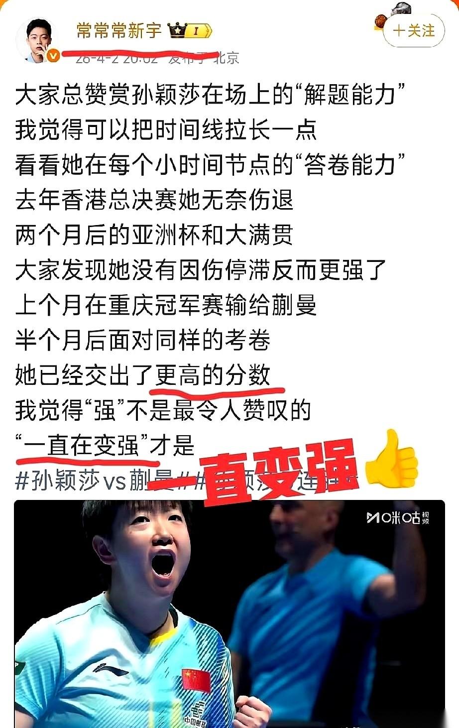 孙颖莎,顶着连续200周世界第一的名号,你以为她眼里只有对手? 不,她最较劲的“敌人”,是那张球桌。 赢了球,她会冲球桌重重点一下头。丢了分,她对着球桌一挥拳头,嘴里念念有词。打完一整场,别人跟对手握手,她还得特意绕过去,跟球桌“告个别”。 场间休息,教练递水,队医递毛巾。她接过来,不是擦汗,而是小心翼翼地展开,轻轻盖在自己的球拍上,那动作,像在给自家孩子盖一张小被子。 当然,这“被子”没暖热乎过几次。 裁判一伸手,直接就给没收了。她也不闹,就眼巴巴看着,下次还盖。 都说这姑娘从小离家打球,把冷冰冰的赛场,活成了自己的童话世界。 所以她那些看着有点傻的习惯,究竟是骨子里的孩子气,还是她对抗那泼天压力的独门绝技?