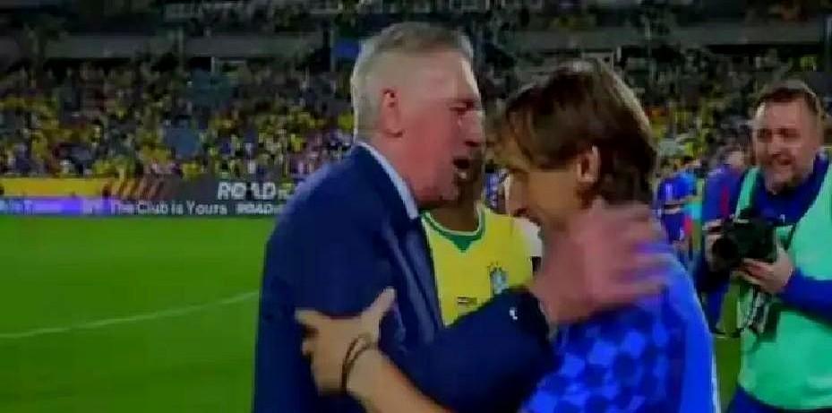 巴西3-1赢了克罗地亚,但赛后这一幕,比进球好看多了。 安切洛蒂一把搂住莫德里