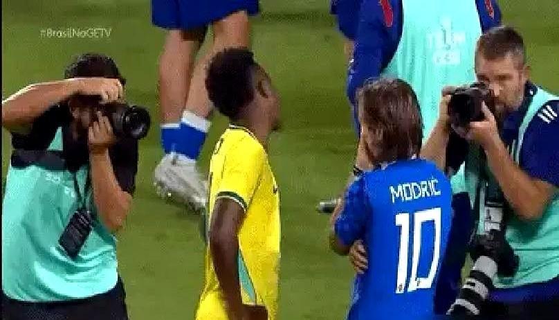 巴西3-1赢了克罗地亚,但赛后这一幕,比进球好看多了。 安切洛蒂一把搂住莫德里奇,头挨着头开玩笑:“你是不是有个巴西祖父?” 两人笑得那叫一个灿烂。卡塞米罗就在旁边看着,一脸姨母笑。 转身,17岁的恩德里克从背后直接抱起了快38岁的莫德里奇!这小子替补15分钟就造点+助攻,简直是“内马尔附体”。 还有维尼修斯,跟老大哥聊了好久。管他身上穿的什么球衣,这帮人一看就是皇马自己家的人。 这画面,真的比任何一个进球都让人心里暖暖的。