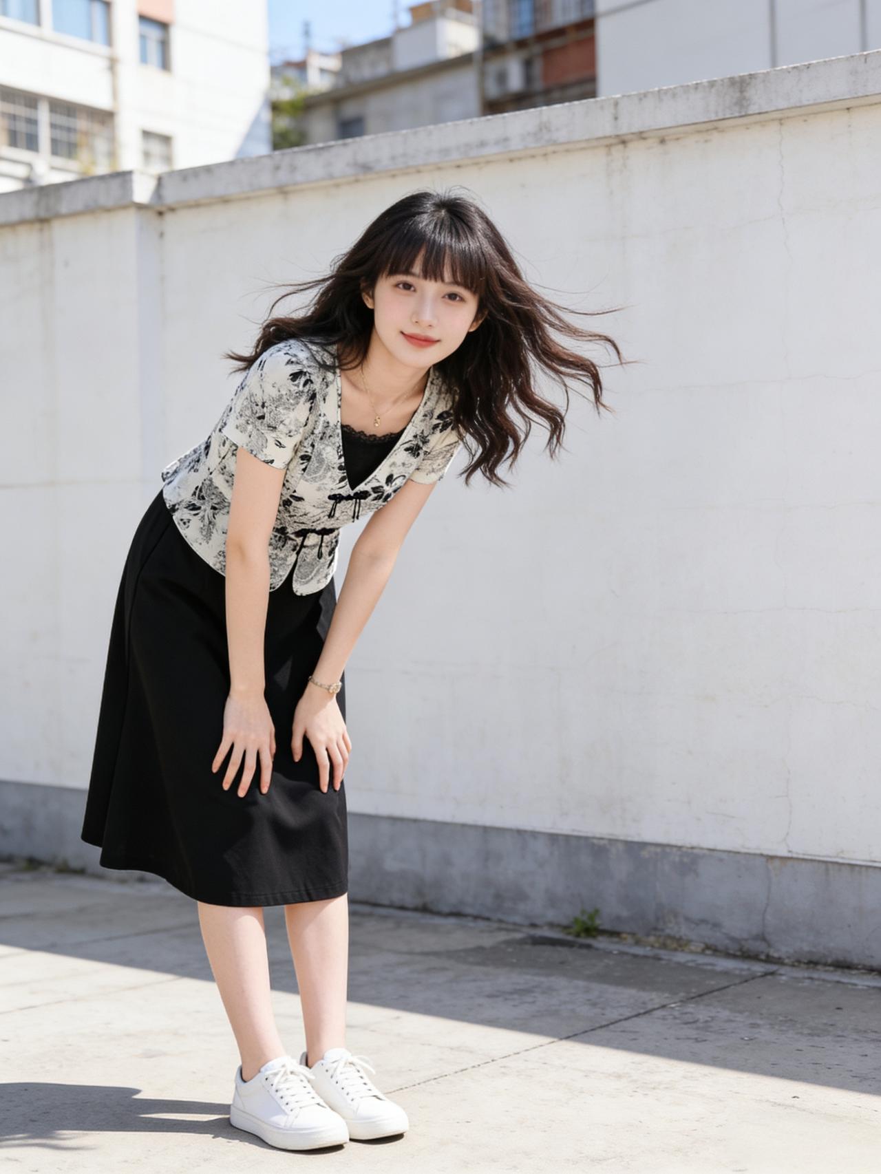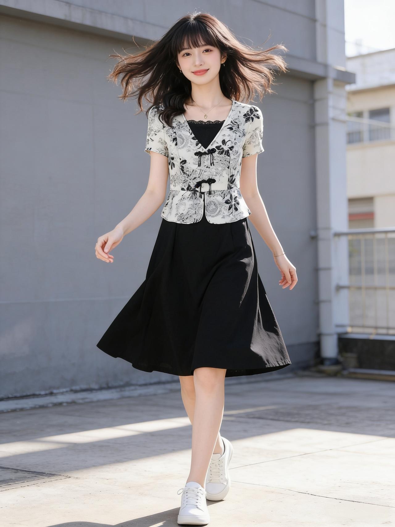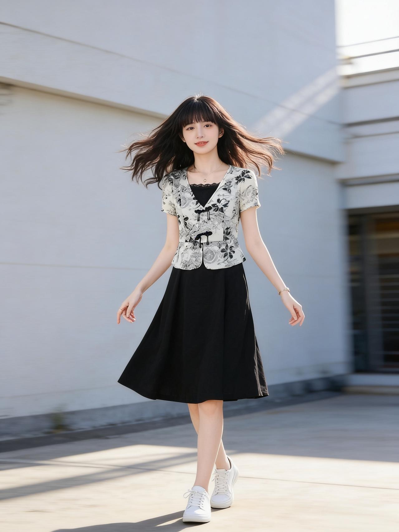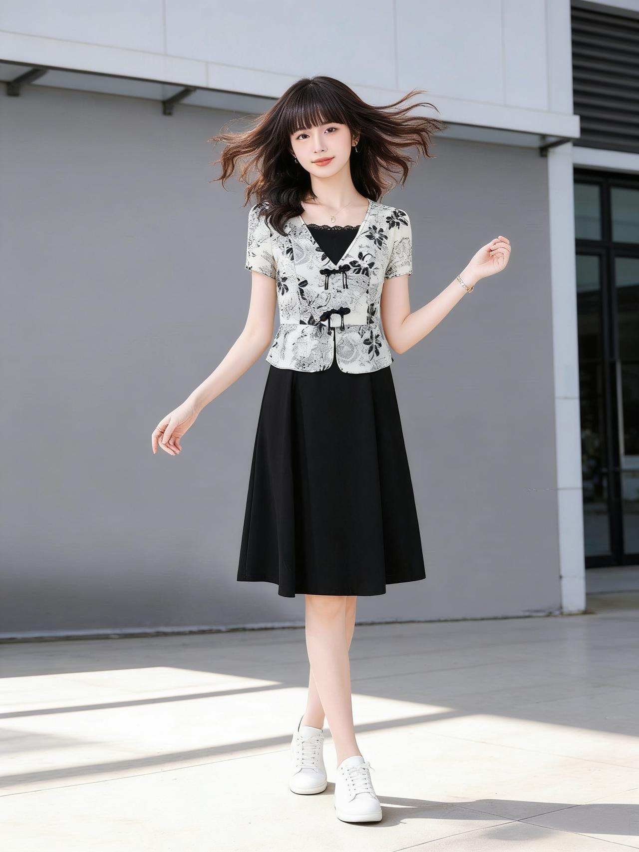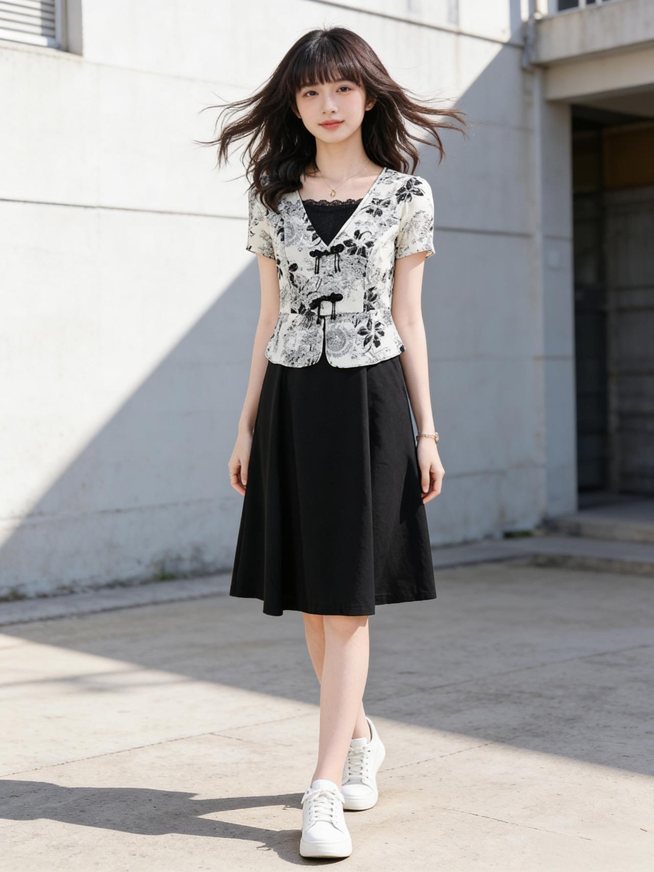 夏日穿搭指南:黑白印花上衣+黑色半身裙,简约又时尚!