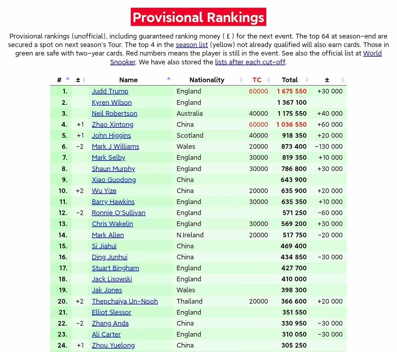 凭借打入巡回锦标赛决赛的6万英镑,赵心童排名上升至第四。特鲁姆普依然霸榜,至少本
