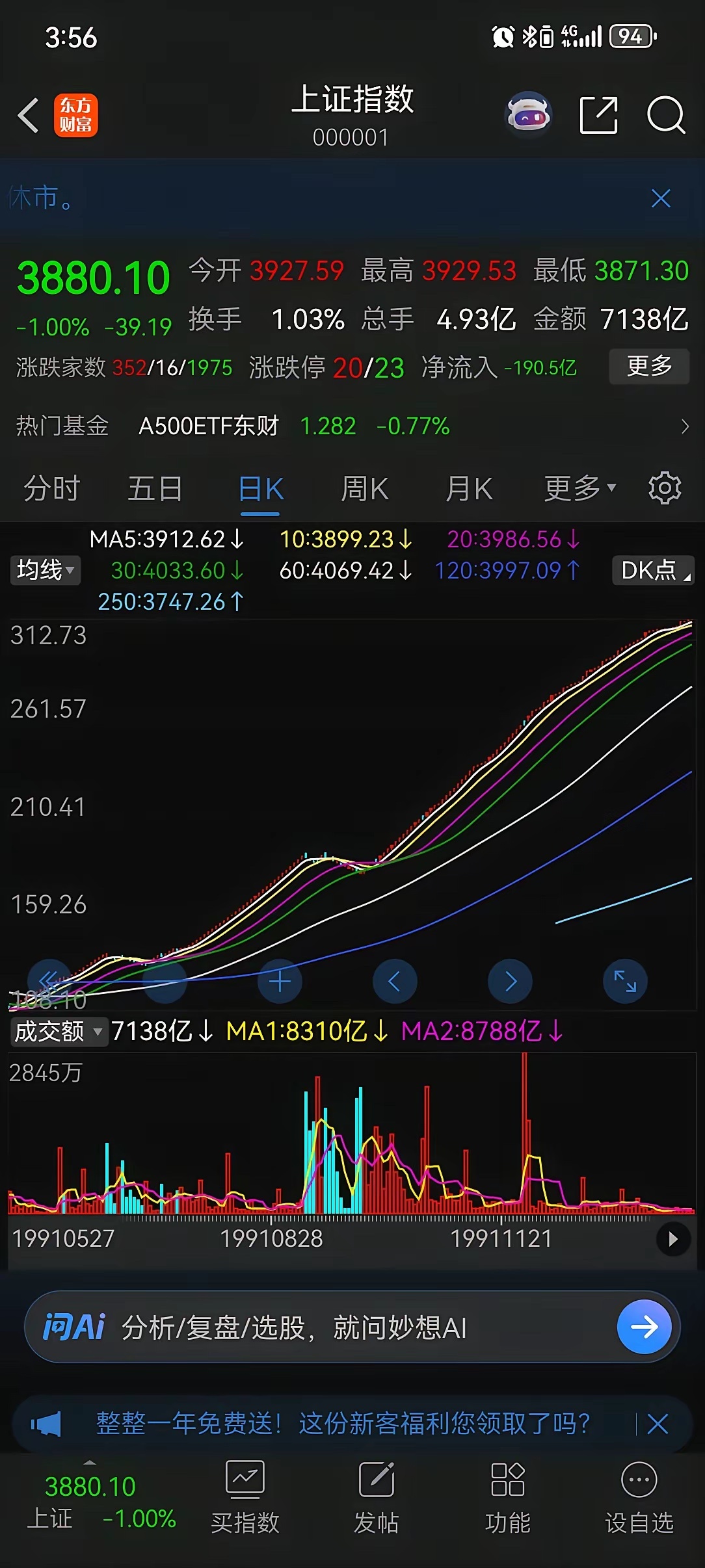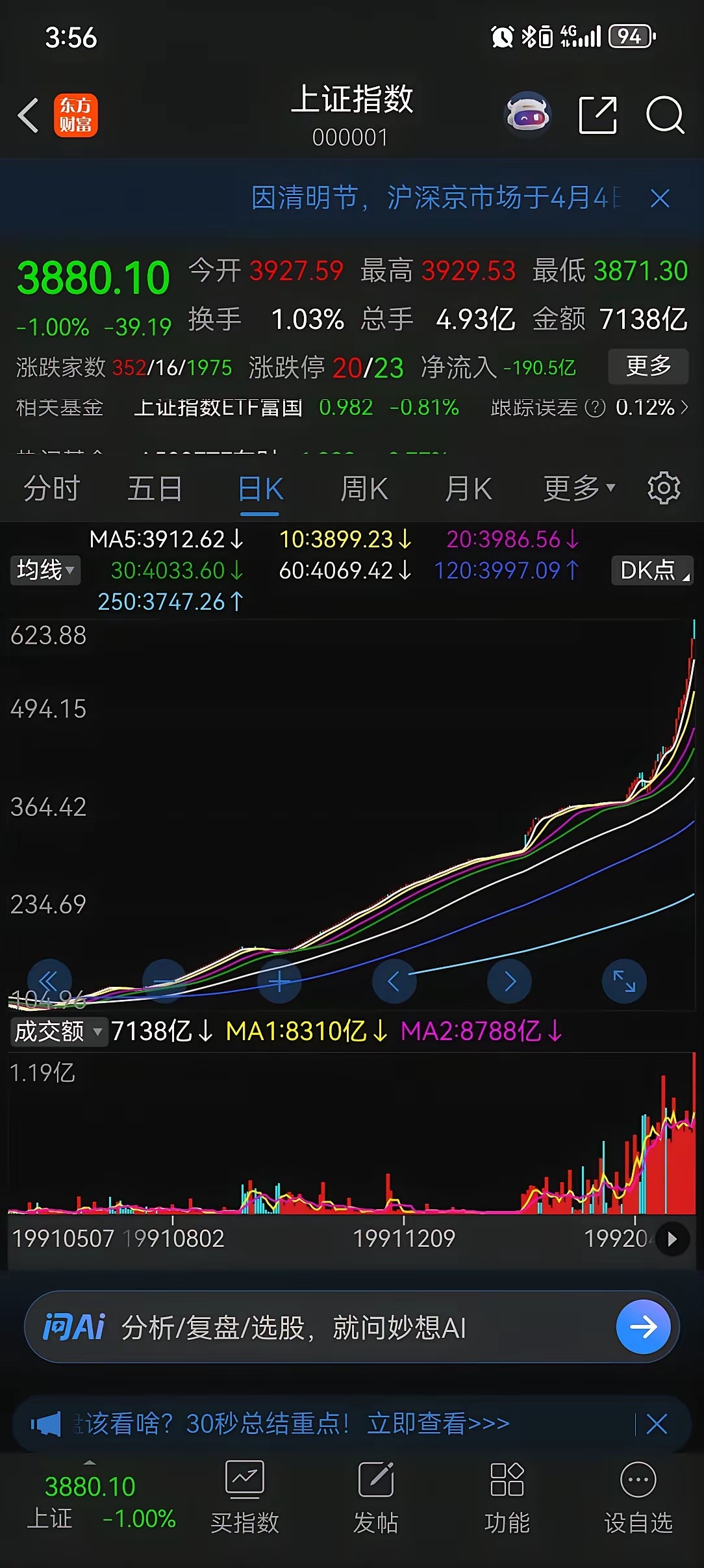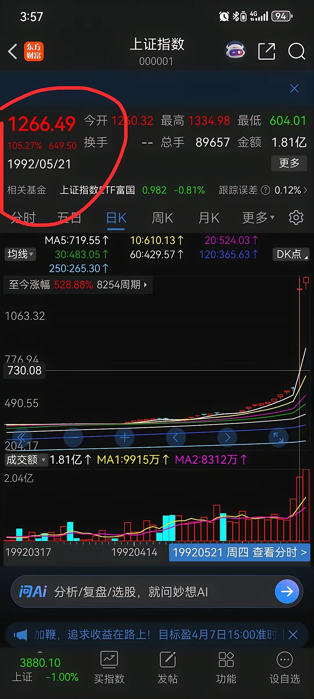这不是哪一只妖股,这是大盘,这是曾经的A股!太可怕了,那时候中国股民明天活在上涨恐惧中!从91年5月17号第一根阳线开始,一直涨到92年5月22号,那时候中国股民每天都活在上涨的恐惧中!最恐怖的是92年5.21号大盘暴涨105.27%!