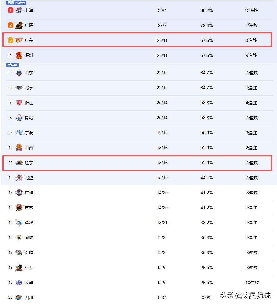 爆冷绝杀!CBA排名风云突变!辽粤冰火两重天,三队无缘季后赛 北京时间4月5日,距离常规赛结束还有最后8轮!第34轮五场比赛赛果直接改写了前四格局,5至12名的座次也发生明显变化。另外还有三支球队已经无缘季后赛。 战报如下,宁波96-66大胜山东,山东前四希望受挫,需要好好总结。北控103-104不敌深圳:史密斯贡献压哨绝杀,深圳豪取九连胜。北控已处于前十二边缘,两队上半场陷入缠斗,末节里勒带队疯狂追分,最后时刻准上篮反绝杀反超1分,不料晚安动作刚做出,后续史密斯在底角折叠身体完成逆天压哨绝杀。 其次,广东100-80狂胜广厦:这是广东赛季首次对阵广厦,恰逢对方后场两大核心孙铭徽和布朗同时缺阵。广东开局便打出进攻狂潮,虽然萨林杰首节伤退,但广厦两大国手胡金秋和朱俊龙同时陷入低迷,广东在徐杰串联下全场保持压制,最终取得大胜,送卫冕冠军赛季首次连败,同时自己收获三连胜,重返积分榜第三。 其他场次,南京99-96险胜江苏;山西102-86轻取新疆。这五场比赛结束后,目前已经确定,34连败的四川,10连败的天津以及3连败的江苏,这三支球队提前无缘季后赛了。 另外,上海30胜锁定常规赛冠军在望,广厦遭遇两连败,但也基本坐稳第二,广东喜从天降——本轮北京和山东同时输球,此前四队同分的胶着局面被打破。广东赢下硬仗后重返联盟第三,并拉开与山东、北京一个胜场的差距。不过后续两轮,广东将连续客场挑战山东与青岛,若能再啃下这两个硬骨头,广东将稳定常规赛第三! 深圳绝杀北控豪取9连胜目前稳定在第四!这赛季最大惊喜就是深圳和宁波,这两队表现不输一些豪门,也期待他们在季后赛舞台大施拳脚。而辽宁的处境和广东是冰火两重天!较为尴尬。球队已失去冲击前6希望,本轮又被山西反超,排名跌至第十一。 虽然暂时没有下滑风险,但99.9%会锁定在附加赛区,常规赛最终排名预估在第7至第11名之间。最后,便是北控、广州、吉林福建以及同曦这五支球队来争取附加赛第12名的最后一个名额。