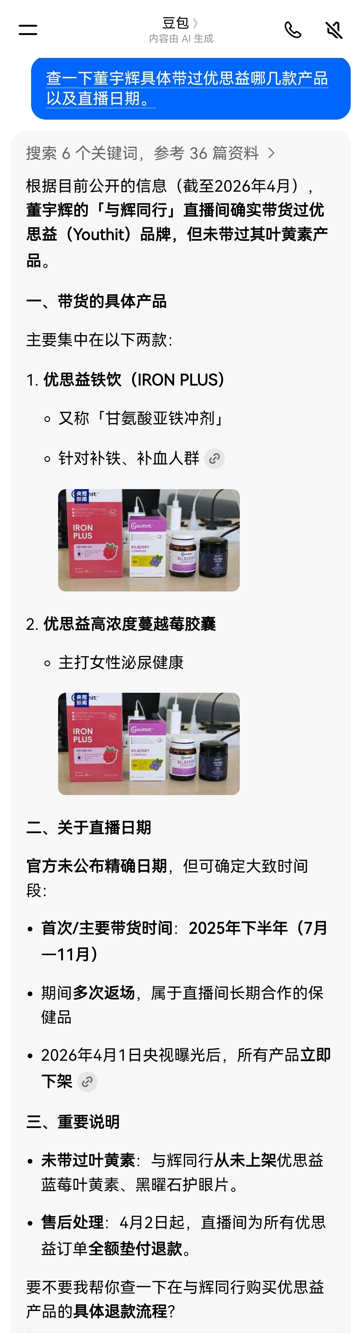 豆包都查不到与辉同行售卖优思益的叶黄素记录,只能承认董宇辉的确没有销售过这款产品,那么全网攻击他的理由是什么? 这也太荒诞了,看到众多媒体与博主下场攻击董宇辉售卖优思益叶黄素,还说被央视曝光,结果一查人家根本就没销售过这款产品。 这哥们只是销售过优思益的蔓越莓与铁饮,结果被全网断章取义攻击,真是树大招风。难道这么多人没有一个仔细查一下记录的,太魔幻了吧。