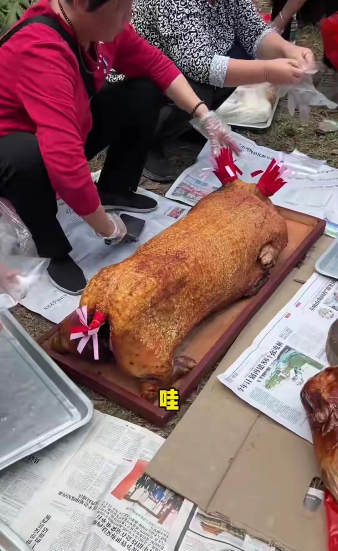 港星黄一山清明广东祭祖,真的抬整只烧猪进山,场面太长见识了! 华南F3广东广西海南每次清明祭祖都让人大开眼界,跋山涉水,开山劈路,一路艰辛。 60多岁的周星驰电影御用配角黄一山也去台山祭祖了,山路坎坷,他们一行人抬着整只烧猪,烧猪上绑着红布,仪式感满满。 搞笑的是,祭拜完他们就现场取材,吃起了烧鸡烧鸭,一人一块,看起来美味极了,主打一个祖宗吃什么自己就吃什么。 不过一路爬这么远的山,消耗肯定大,这时候能吃上烧猪应该是很满足。