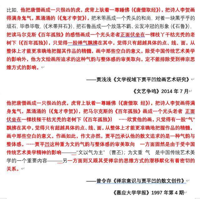 “抒情的森林”还发现,贾浅浅论文中关于贾平凹画作《唐僧取经》《鬼才李贺》《百年孤独》等作品的描述,与学者曾令存1997年发表的《禅宗意识与贾平凹的散文创作》一文的文本存在大面积重叠。不仅画作名称、具体意象描述,如“黑涌涌的”、“光头老者”等语句雷同,其关于贾平凹绘画“追求气韵与整体感”、“受禅宗思维影响”的核心观点及完整论述段落也近乎一致,且未标注引用文献。