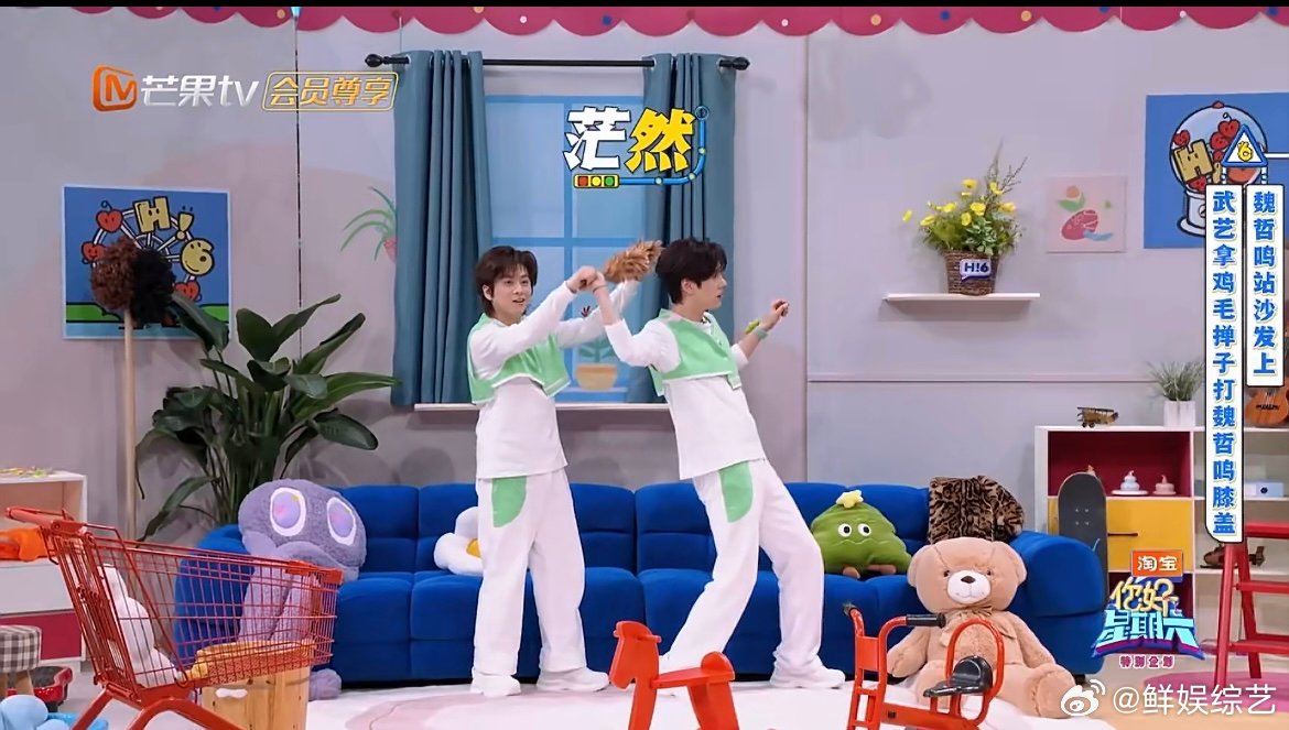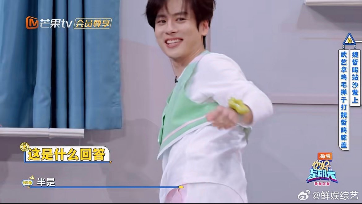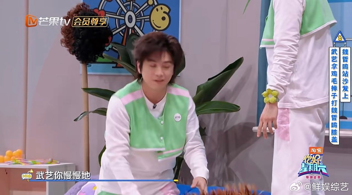 武艺跳起来打膝盖终于有画面了魏哲鸣站在沙发上,武艺手持鸡毛掸子完成跳打膝盖,这画面比段子还好笑。你好星期六