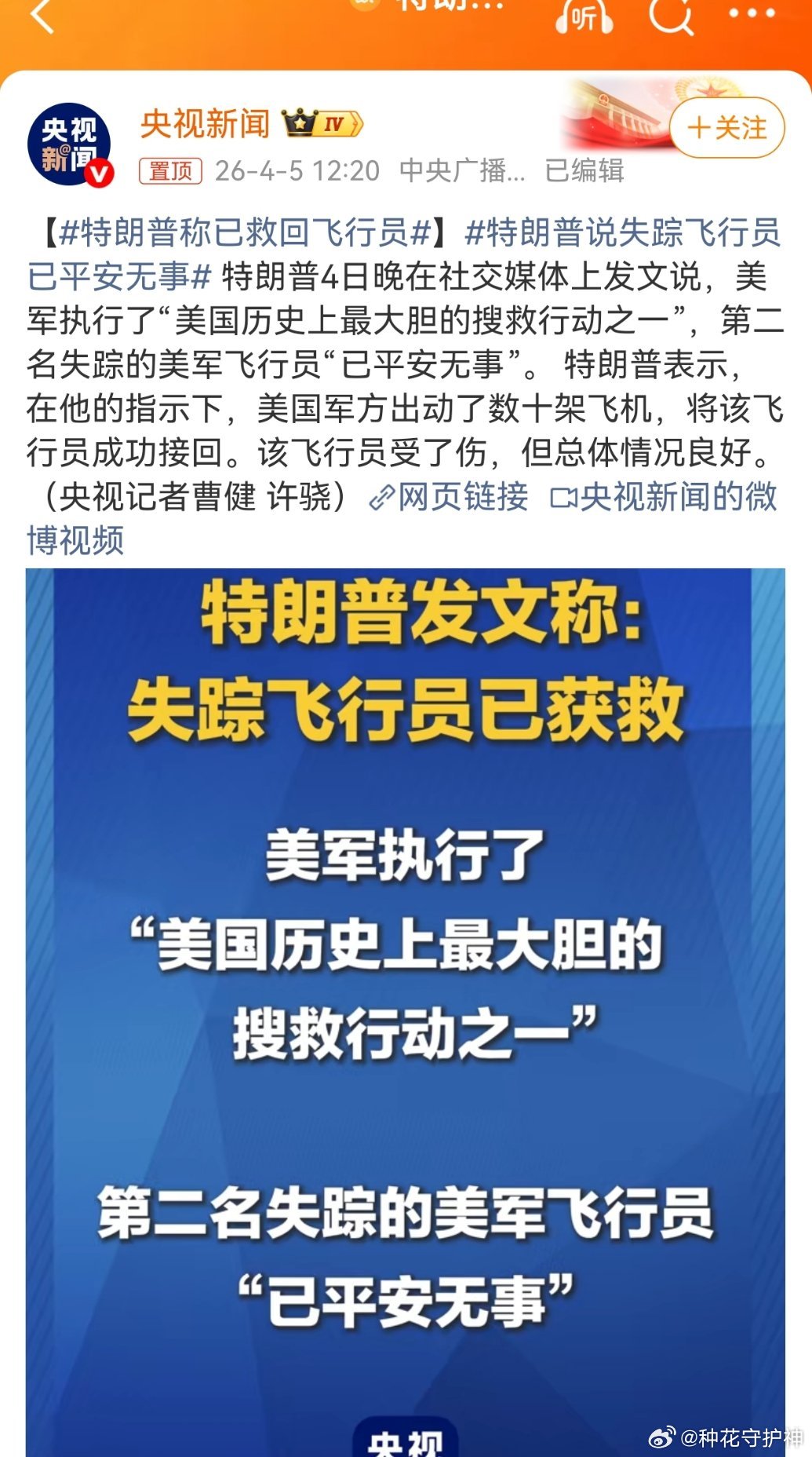 特朗普称已救回飞行员