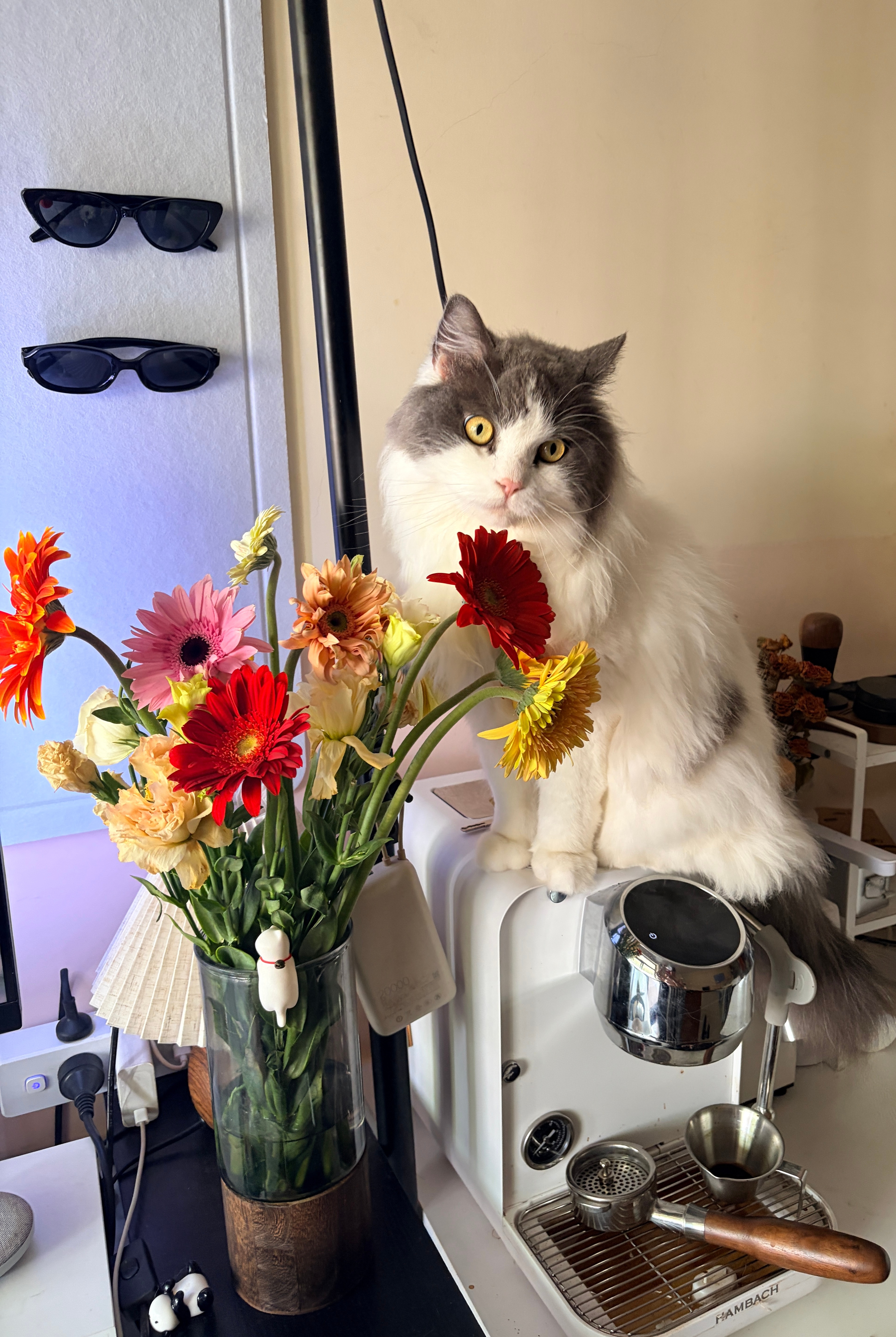 它说它想跟花合照一张,拍完第一张它说它怎么只有花?然后跑到了花旁边又要求我拍了一张