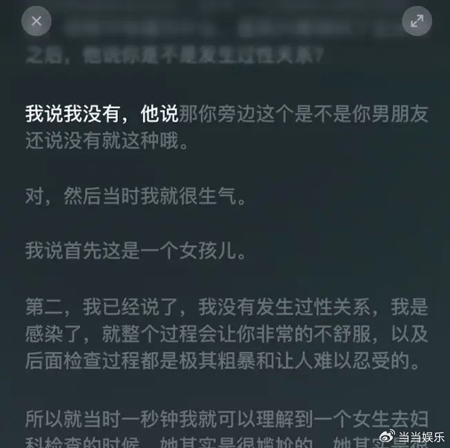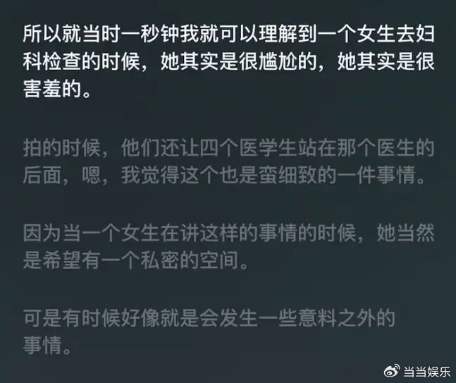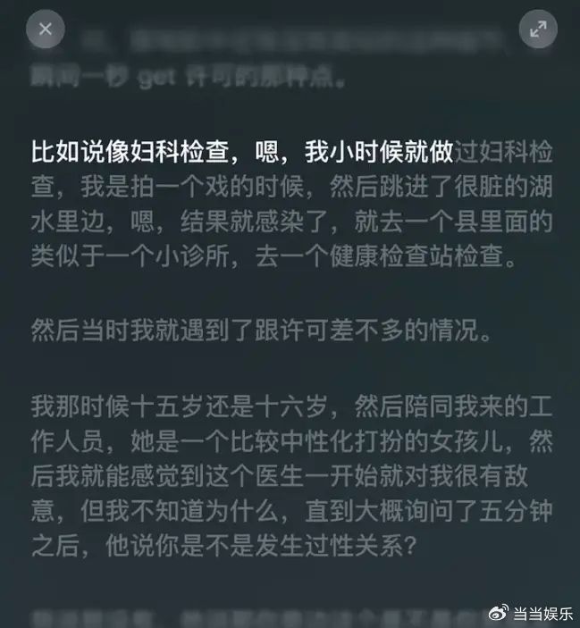 开篇爆点文淇近来于播客之中,颇为坦率地说起了自身头一回做妇科检查时那令人尴尬的经历,未曾料到那次检查,不但身体方面感觉难受,还遭医生当着面询问有无性关系。这位年轻女演员当时才十五六岁,面对这种羞辱感至今记忆犹新。拍戏跳进脏湖水惹的祸文淇回忆讲,那个时候正在拍摄一部戏,这部戏的剧情要求她跳入一个格外脏污的湖水中。结果没过多久身体就出了状况,去医院一查才知道是感染了。她当时年纪小,根本没想到自己会遇到这种妇科方面的问题。彼时,剧组于县城周边进行取景,因条件受限,她唯有前往当地的一家小诊所去做检查。那个被称作健康检查站的地方,设施十分简陋,和大城市里的正规医院,根本就没办法相比较。一个十五六岁的小姑娘面对这种情况,心里其实特别害怕。诊所医生的奇葩质问令文淇最为恼怒的并非身体方面所遭受的伤痛,而是医生一开始就询问是否有过性行为。她讲,她本身那时气得严重,直接回击回去讲,“我未曾有过性行为,我是被感染了”。这种先入为主的质问方式让她觉得特别不被尊重。身为医生,其语气之中,以及眼神里面,俱都携带着一种具备审视性质的意味,仿佛在她所处的这个年纪,前来诊治妇科方面疾病,就必然是存在着问题的。文淇讲,在那一刻,她体会到了那种程度极大的羞辱之感,明明是由于工作而致使受伤并受到感染,然而却被视作是行为不检点的女孩子。这种偏见让她至今想起来都觉得不舒服。粗暴检查留下心理阴影过程的检查,更是令她难以去忍受,医生的动作,极其地处以粗暴,全然不顾及一个小姑娘的感受。文淇讲,整个的过程之中,她全都是在咬紧牙关,顽强地硬撑着,那种所感受到的疼痛,以及被侵犯的感觉,致使她格外想要哭出来。