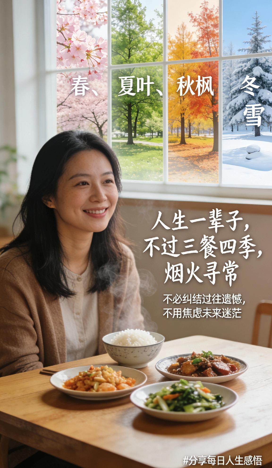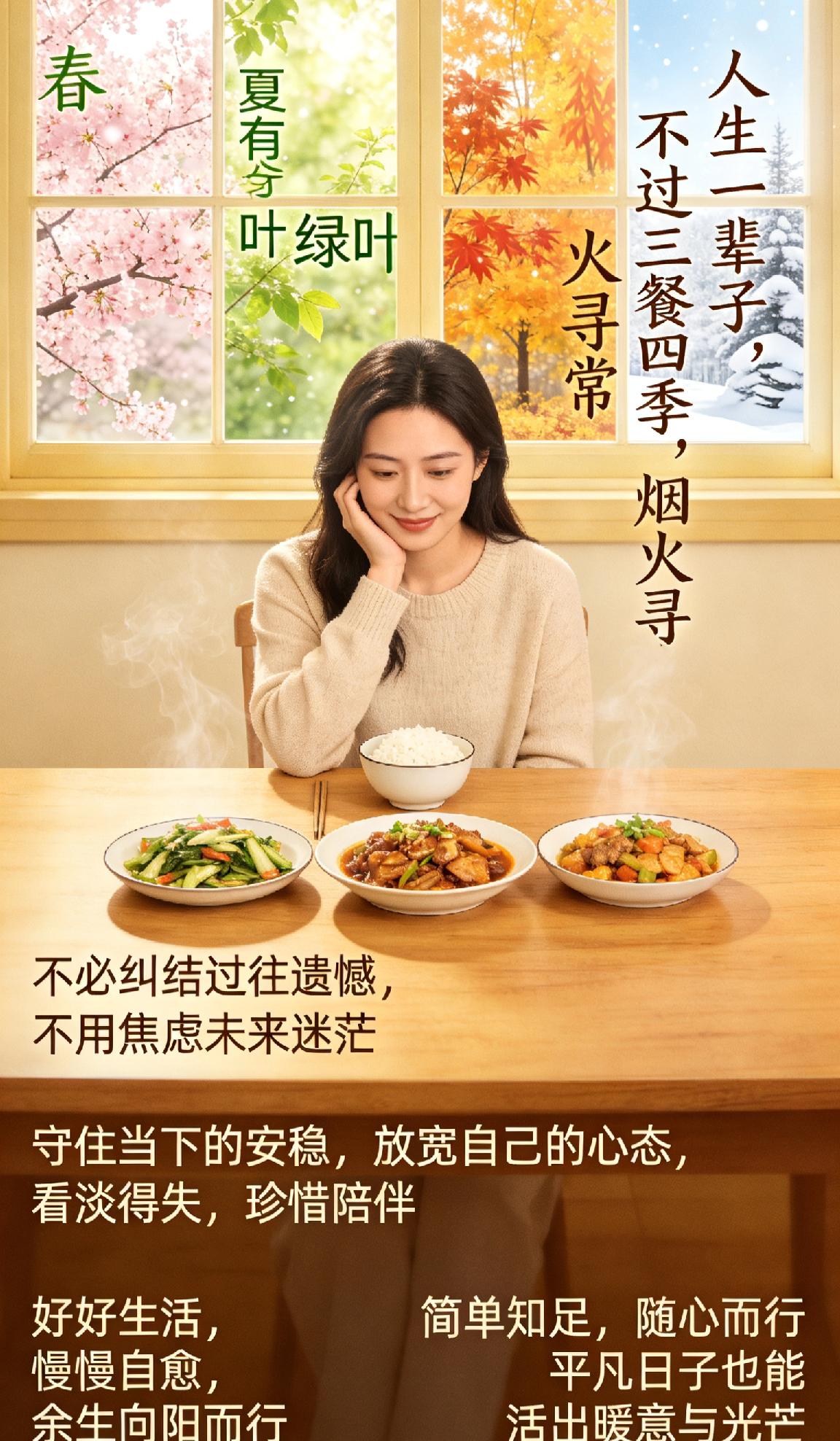 人生一辈子,不过三餐四季,烟火寻常。不必纠结过往遗憾,不用焦虑未来迷茫。守住当下的安稳,放宽自己的心态,看淡得失,珍惜陪伴。简单知足,随心而行,平凡日子也能活出暖意与光芒。好好生活,慢慢自愈,余生向阳而行。 分享每日人生感悟