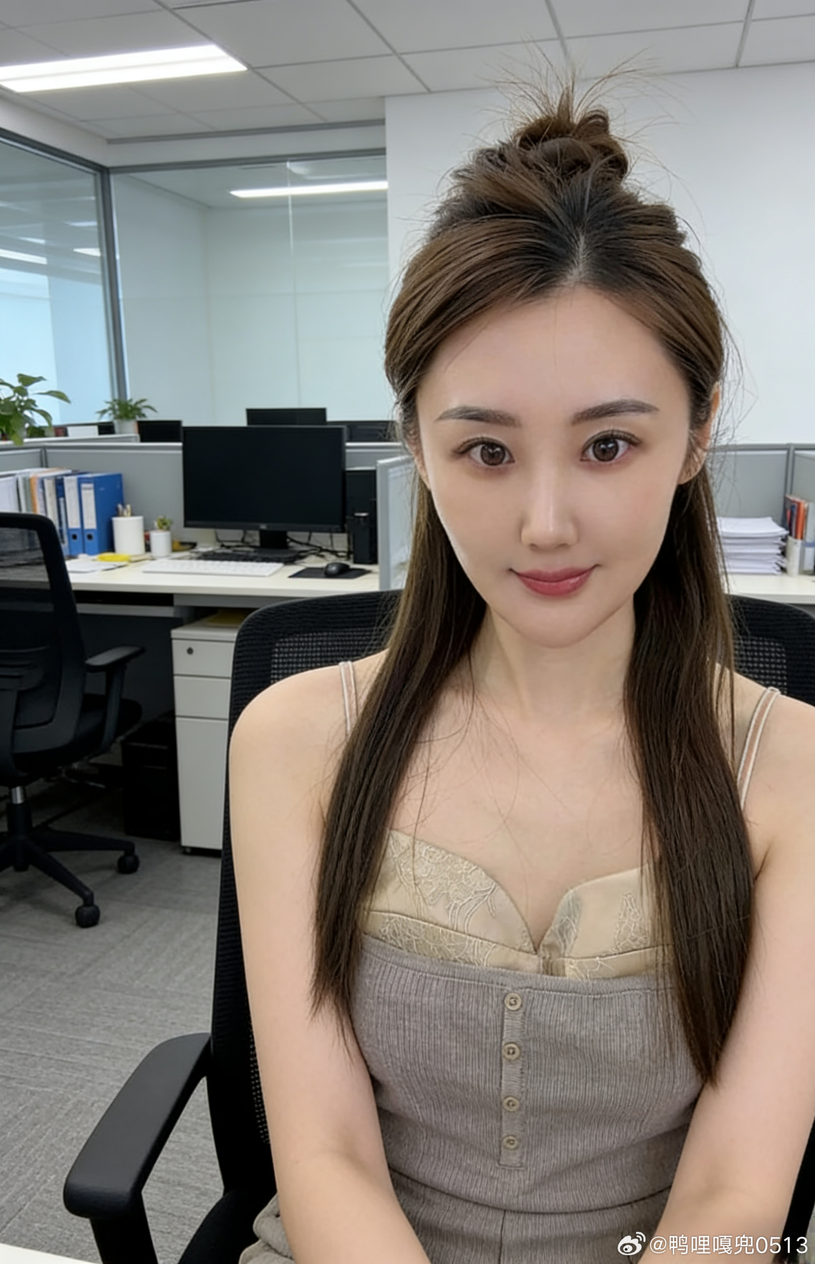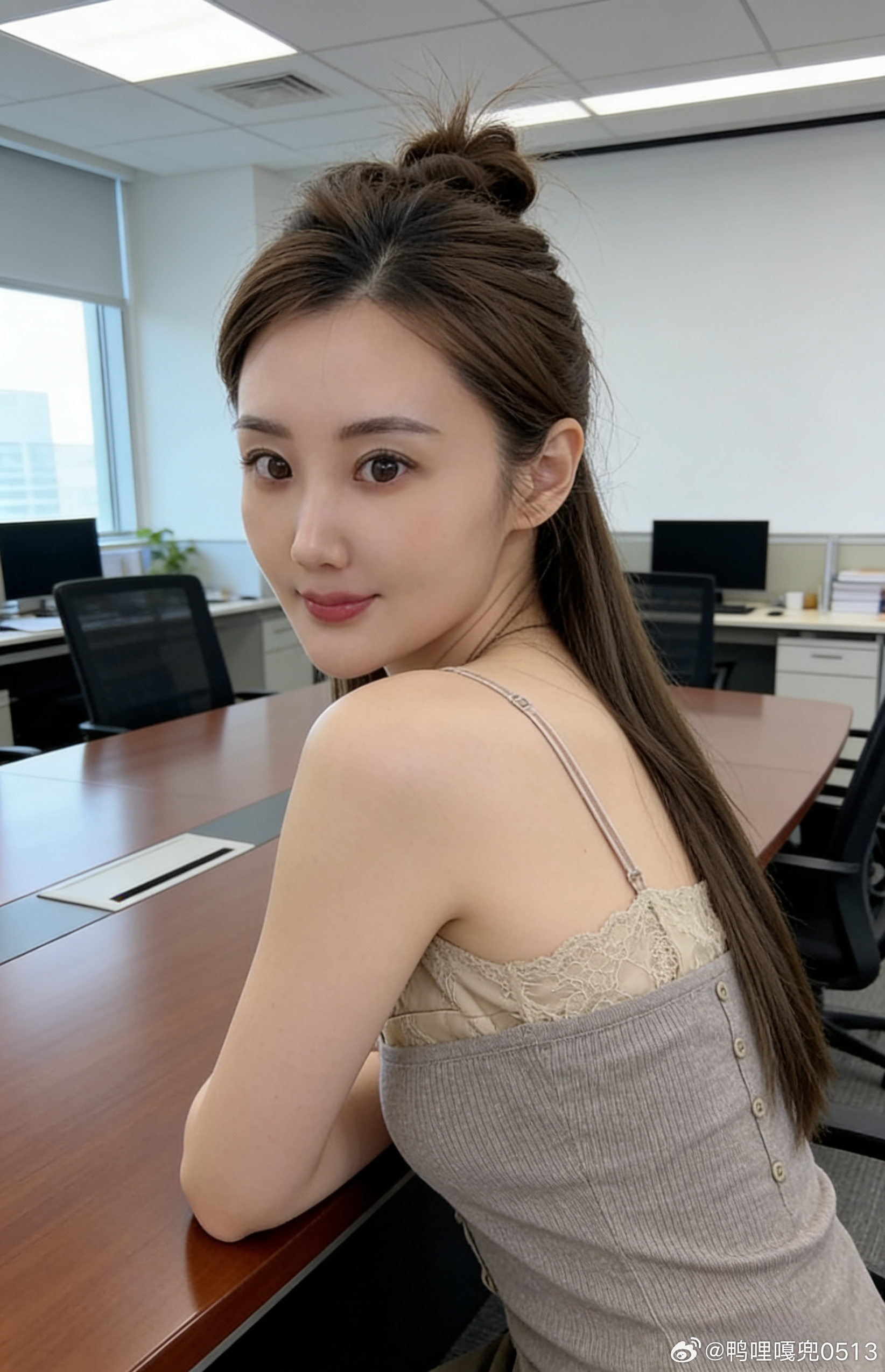 清丽女人明眸含星带魂长睫灵动。玉肤凝脂水润透亮,亮泽丰唇魅惑。松盘发髻缀珠光,祖