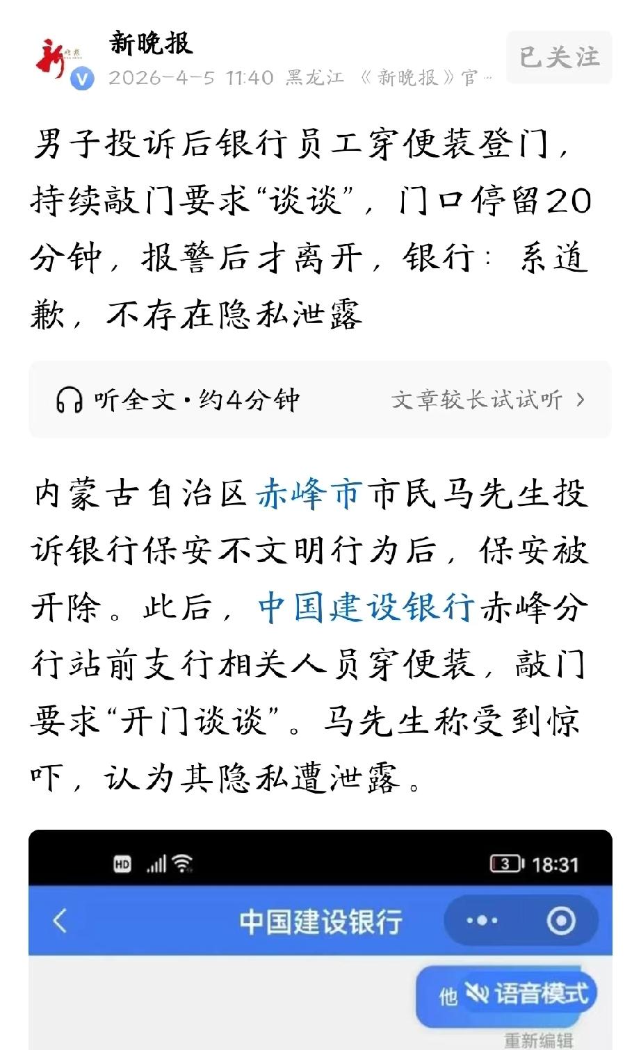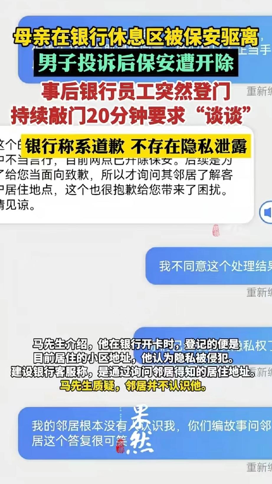 内蒙古赤峰,男子带着73岁的母亲到银行办业务,坐在大厅休息时,一个睡觉的保安骂骂咧咧,说吵到他了。男子气不过将保安投诉,保安因此被辞退。两天后,男子再次去银行,谁知,被几个穿便装的业务员尾随到家门口,持续敲门20多分钟,说要和他谈谈。母亲患有心脑血管疾病,吓得脸色惨白,男子报了警。男子细思极恐,认为银行随意泄露自己隐私,要求道歉并赔偿。 3月17号中午,马先生带着腿脚不好的母亲去家附近的银行办理业务。 母亲73岁了,腿脚不好走不动了,他就扶着她坐在银行大厅旁边一个办事区域的沙发上,那儿本来是给客户准备的休息区,算是公共地方。 母子俩刚坐下,离他们两米远的一张L形沙发上,一个保安正脱了鞋躺着睡觉。 马先生和母亲也没吵没闹,结果那个保安嫌他们影响自己睡觉,大声嚷嚷让他们走。 马先生心里挺窝火,但没跟对方吵,只是偷偷拍了张保安的照片。 回去后,他越想越气,就通过建设银行的客服小程序投诉了那个保安,后来,银行把那个保安开除了。 本来以为这事儿就过去了,3月19号上午10点,马先生又去那家银行激活银行卡。 办完业务出来,大概10点半,他走到小区门口,发现身后有两个穿着制服的银行女员工一直跟着他。 马先生心里咯噔一下,回头问她们干嘛,对方说想跟他“谈谈”。马先生当时就拒绝了,我都不认识你,和你有什么好聊的。 那两个女员工也没再纠缠,转身走了。 马先生以为这就完了,可没想到,到了11点半,他刚到家没多久,突然门外传来“砰砰砰”的敲门声,特别急,一直不停。 他吓了一跳,赶紧透过猫眼往外看,门外站着两三个人,都穿着便服,听说话是银行主管和保安公司的人。 他们不按门铃,就是使劲敲门,嘴里还喊着“开门,咱们谈谈”。 马先生很气愤,转头看了一眼里屋,73岁的老母亲心脏和脑血管都不太好,最怕吵,这会儿已经被吓得脸色发白。 他一边安抚母亲,一边隔着门让对方赶紧走,可那几个人就是不走,在门口足足待了20分钟。 马先生实在没办法,只好报了警,警察来了之后,问明情况,把那几个人劝走了。 事后,马先生越想越不对劲,自己的住址是怎么被银行知道的?他办银行卡的时候登记过小区地址,但没写具体门牌号。 而且他住的是个老小区,没电梯也没保安,那几个人是直接爬楼梯上来的。 最让他害怕的是,对方穿着便服,谁知道是真的银行的人还是骗子? 母亲被吓得这几天一直睡不着觉,老问“咱们能不能搬家”。 马先生觉得自己的隐私被严重侵犯了,就又通过银行客服小程序投诉。 客服那边的解释是,上门是为了“当面道歉”,至于怎么找到他家的,客服说是“问了邻居”。 可马先生租这个房子是为了方便给母亲看病,邻居根本不认识他,这哪是道歉啊,分明是来吓唬人的。 后来记者联系了银行,工作人员一口咬定,不存在隐私泄露的事,已经跟马先生道过歉了,双方也达成了和解。 马先生承认,银行确实保证以后不再上门打扰,也道了歉,但关于赔偿的事,两边还在商量。 《民法典》第一千零三十三条:除法律另有规定或者权利人明确同意外,任何组织或者个人不得实施下列行为: (一)以电话、短信、即时通讯工具、电子邮件、传单等方式侵扰他人的私人生活安宁;(二)进入、拍摄、窥视他人的住宅、宾馆房间等私密空间;(五)处理他人的私密信息 。 银行及其工作人员未经马先生同意,非法获取并使用其住址信息,尾随跟踪至小区、持续猛烈敲门20分钟,严重侵扰其私人生活安宁与住宅私密空间。 同时,泄露、违规处理客户登记的住址等私密信息,已构成对马先生及其母亲隐私权的明确侵犯 。 银行所谓“问邻居找到地址”的说法,既非合法授权,也违背个人信息处理的合法、正当、必要原则,不能成为免责理由 。 马先生有权依据本条及民法典相关规定,要求银行承担停止侵害、赔礼道歉、赔偿精神损害抚慰金等责任。 其母亲因受惊吓导致健康受损,也可主张相应的精神与医疗赔偿 。