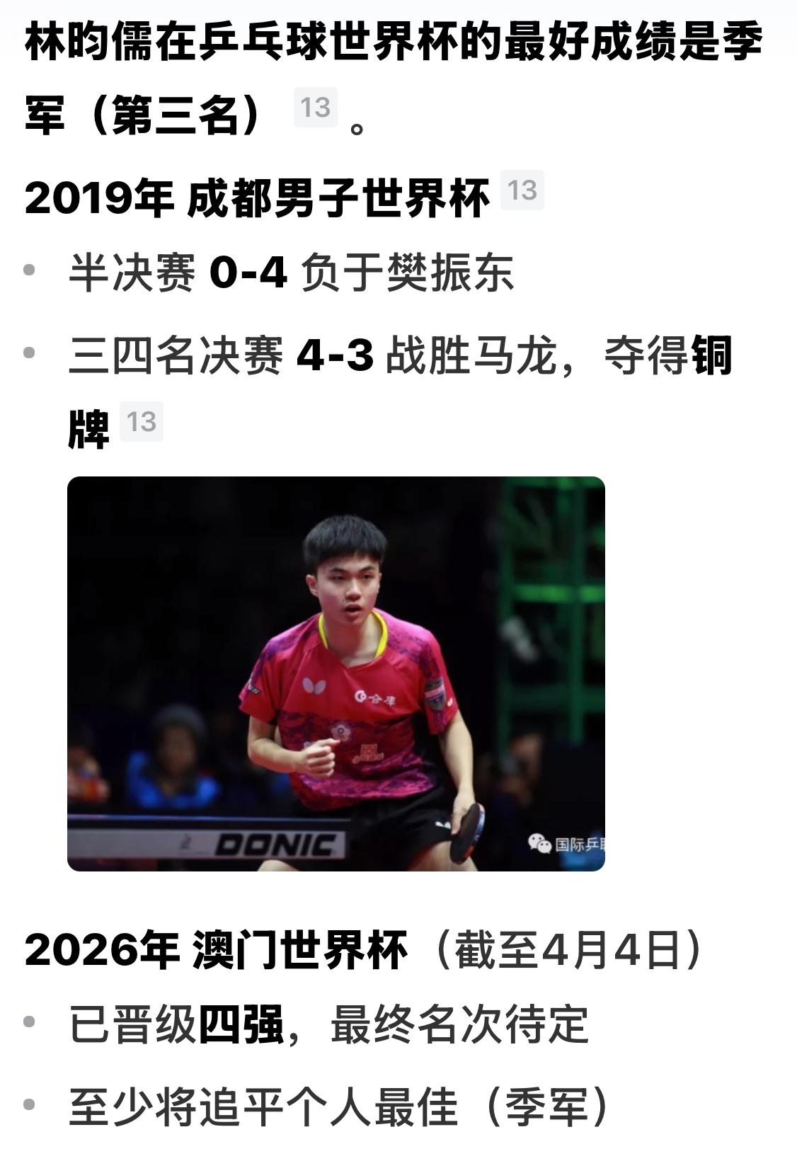 松岛辉空4:3林昀儒首次晋级澳门世界杯决赛,笑得太开心! 4月5日澳门世界杯男单半决赛中, 林昀儒3:4松岛辉空,无缘晋级决赛! 7:11,11:6,12:10,9:11,5:11, 11:2,6:11 松岛辉空今年17岁,今天 太想赢球,反而压力很大, 在赢了一局之后,被林昀儒 限制住了! 反而林昀儒今天的状态非常好, 心态也非常好,林昀儒在昨天的 采访中说了,已经有牌了, 心里很知足,就是尽力往前走一步! 心态很重要,林昀儒今天打的非常 稳,没有急功近利! 最关键的第四局被松岛逆转后, 松岛的气势上来了, 第五局松岛11:5越战越勇。 松岛也是状态型选手,不能让他 起势! 决胜局林昀儒2:5落后,4:8, 5:8,6:8,6:11林昀儒出局了, 止步半决赛! 在这以前林昀儒世界杯最好成绩就是四强,这次澳门世界杯打进四强, 还是没有突破自己! 松岛下一场将对阵王楚钦与雨果 的胜出者!