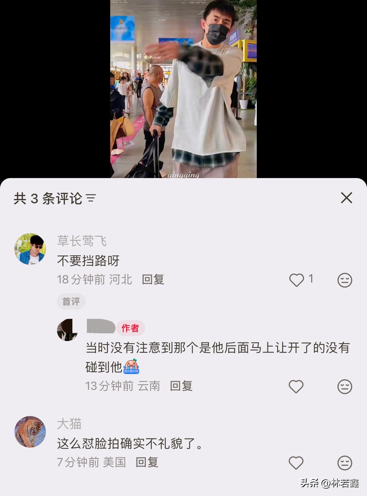 有网友站在林更新的前方拿手机拍视频,林更新走近了以后,面露不悦,伸手希望网友。不少支持林更新示怼脸拍确实不对,