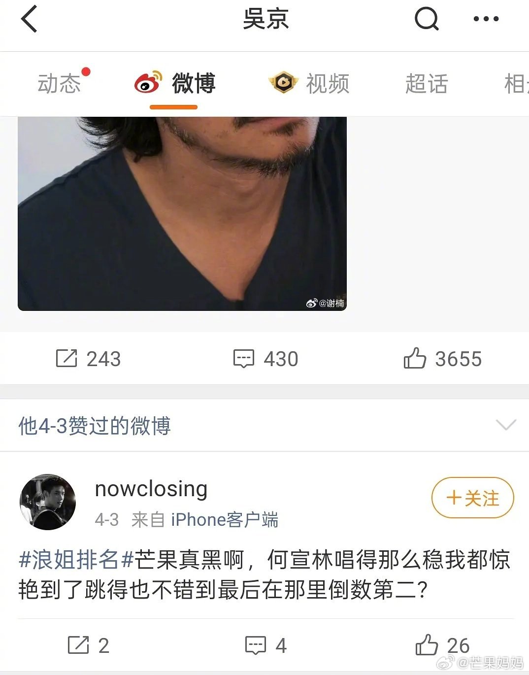 吴京点赞吐槽浪姐博文