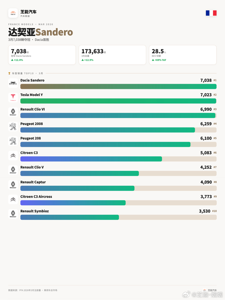 欧洲车市|法国2026年3月:特斯拉排第七