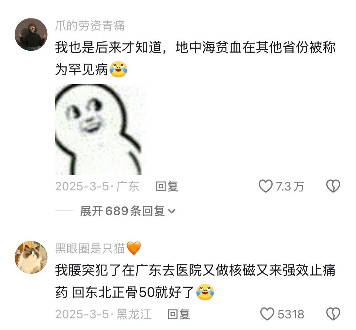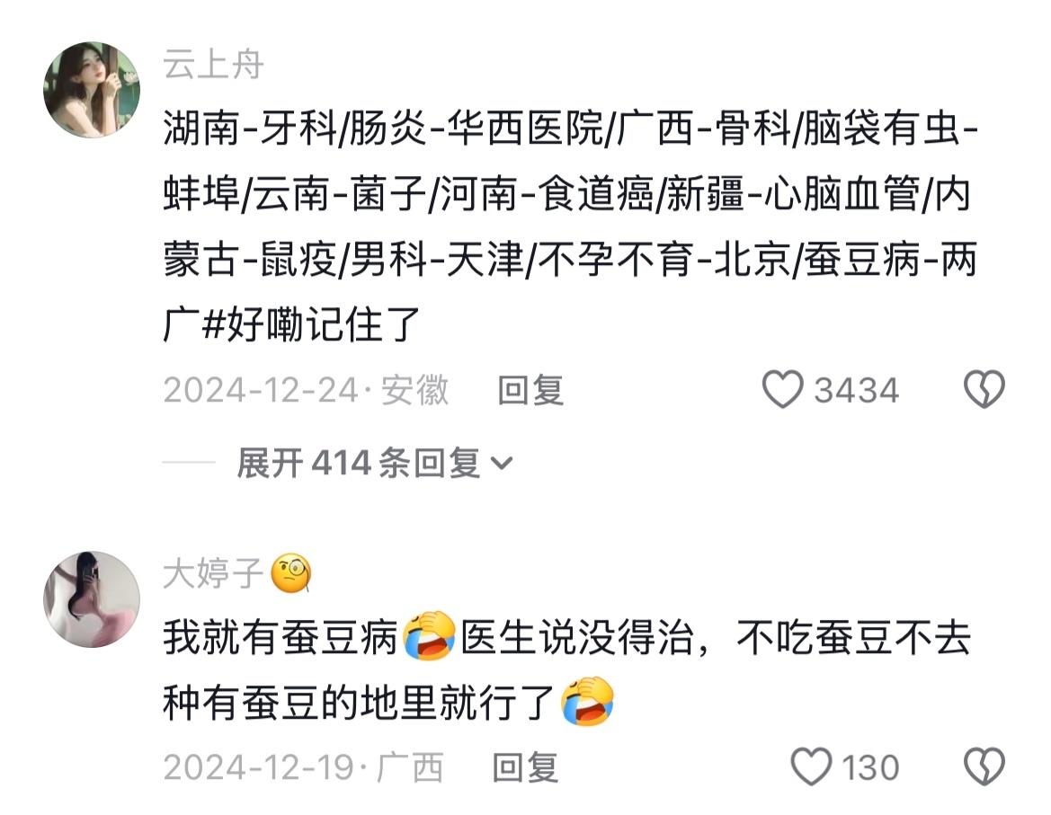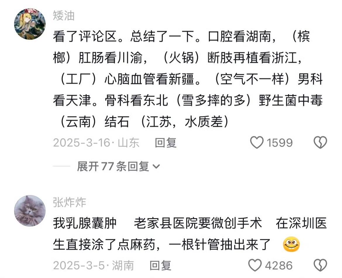 怪不得古代神医都是到处游历!原来看病也要分地域啊。 广东:地中海贫血,常见遗传病[流泪] 其他省:罕见遗传病[笑哭] 看下评论区大概总结一下就是东北骨科,湖南口腔,成都肛肠,南京呼吸,眼科,云南蘑菇中毒,蛇虫鼠蚁。北京不孕不育,天津男科,河南耳鼻喉。