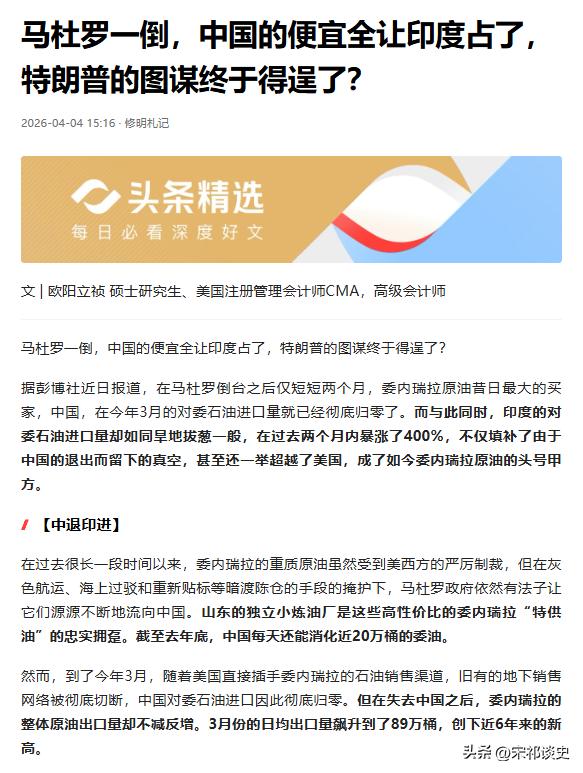 马杜罗一倒,中国便宜全被印度抢了,特朗普笑得合不拢嘴? 马杜罗倒台才两个月,中国停购委内瑞拉原油,进口量直接归零。 而印度却趁虚而入,进口量暴涨400%,直接超越美国,成了委油头号买家,特朗普的阴谋彻底得逞了? 以前,委内瑞拉的便宜原油,靠着各种方式源源不断运往中国,山东小炼油厂天天抢着要,每天能消化近20万桶。 可马杜罗倒台后,美国直接接管委油销售,切断了中国的渠道,还授权西方巨头代销。 这根本不是巧合,是特朗普的精密算计! 他推翻马杜罗,就是为了切断中国的廉价能源补给,还特意给印度抛橄榄枝,豁免关税换印度买委油,特朗普直言这是“重大胜利”。 印度也不傻,中东能源紧张,正好趁机捡便宜、对冲风险。 但大家别慌!委油仅占中国原油进口的4%,根本撼动不了我们的能源安全。 我们早有准备,靠海上仓储缓冲,还找了替代油源,甚至拿到了更优惠的价格。 印度现在贪的便宜,迟早要被美国的政治条件套牢,而中国,早已稳操胜券!