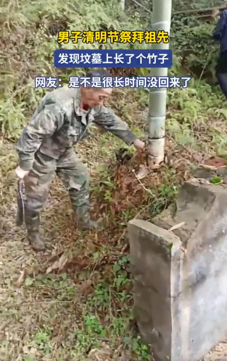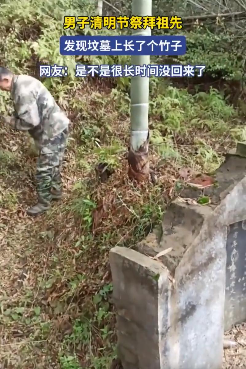 江西,一男子清明上山祭祖,结果到了地方,却发现祖先的坟上竟然长了一根竹子,而且不偏不倚的长在了坟头正中间,网友:这是不是很长时间没回来了? 男子清明照例带着家人上山祭祖。他们家的祖坟在一片竹林边上,往年去的时候,草是有的,竹子偶尔也冒,但都在旁边,砍掉就行。可今年一到地方,男子愣住了 坟头正中间,直直地长出了一根竹子。不是歪的,不是斜的,就那么端端正正地从坟顶冒出来,比周围的杂草都显眼 一家人围着看了半天,谁也没先开口 最后还是男子先动手,拿起镰刀准备砍掉。旁边有人说了句:要不要先拍个照?这才有了后来网上流传的那段视频 视频里能清楚看到,这片竹林很密,地面铺着厚厚的枯竹叶,周围不少老竹子和新发的笋。但唯独这一根,位置太过特殊 男子一边清理杂草,一边嘀咕:去年回来还没见着,今年就这么高了 视频发到网上后,评论区热闹得很。有人说这是竹子有灵性,替祖先挡灾;有人说这叫发竹,寓意家族兴旺;也有人开玩笑说:这是不是好几年没回来了,竹子都长到坟头上去了 说起来,坟头正中间长竹子,这种事在老一辈眼里,确实不是小事 按照民间的一些说法,坟上长树长竹,要看长的是什么、长在哪里。长在边上,一般认为是好事,说明地气旺,有生机。但长在正中间,尤其是笔直一根,就有两种截然不同的解读 一种认为,这是祖先显灵,竹子空心,代表子孙要虚心做人,节节高升,是吉兆 另一种则认为,竹子根系发达,会钻入棺木,破坏先人安息之所,而且竹子长得快,几年就能把坟包撑裂,必须尽早清除 两种说法都有道理,但站在实际的角度看,这根竹子确实得处理 不是因为迷信,而是因为竹子这种植物,看着秀气,底下却厉害得很。竹鞭在地下横着长,一节一节地钻,几年时间就能把一片土搅得乱七八糟。如果不及时砍掉,明年可能就不是一根,而是一丛 到时候坟包变形,墓碑歪斜,再想修整就费大劲了 所以男子最后还是把竹子砍了,把根也刨了一部分出来。视频里他说了句很实在的话:不管好不好,长在中间总归不像样,收拾干净,心里踏实。