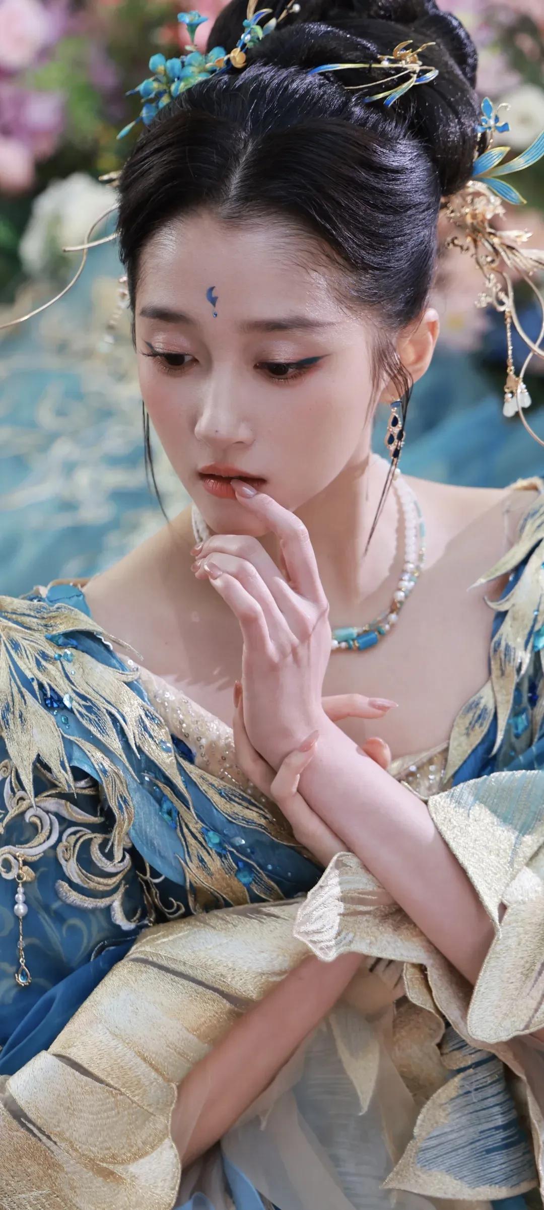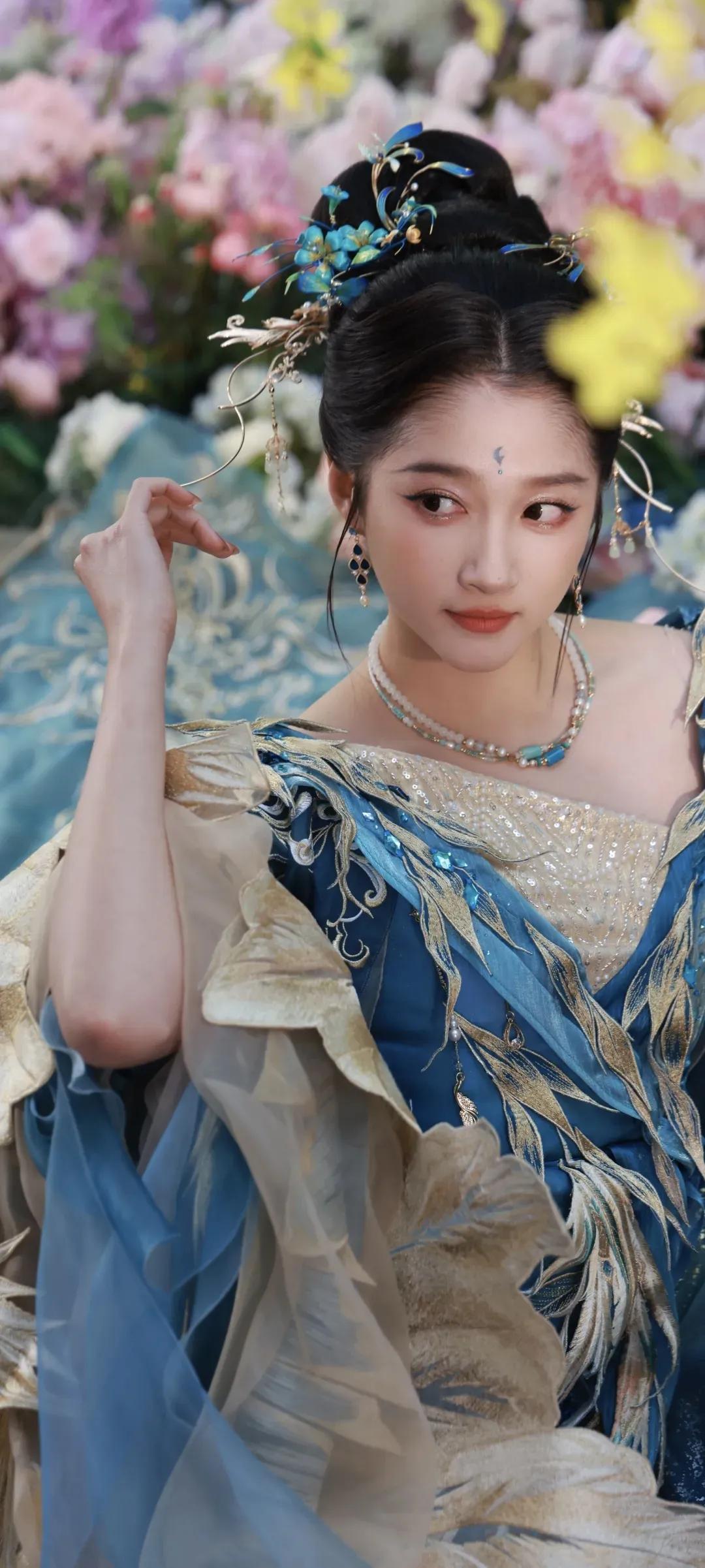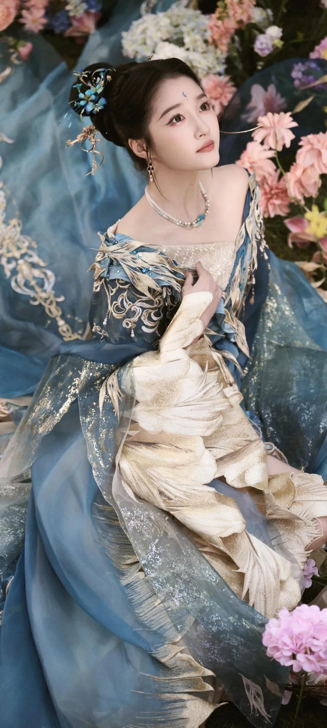一袭蓝金交织的古风华服,绣满灵动羽纹,层叠纱幔如流云漫卷,关晓彤化身从古籍中走出的古典美人。点翠发簪缀于发间,额间花钿添了几分灵动,眉眼间是少女的明媚与古典的温婉,一抬眼、一垂眸,皆是风情。 花影簇拥间,她或抬眸浅笑,或低眉凝思,将东方美学的雅致与灵动演绎得淋漓尽致。正如她所说:“努力是为了让自己有更多选择的权利。” 这份在时光里沉淀的底气,让她在古装造型中愈发耀眼,每一个镜头都美得像一幅流动的古画。 蓝金为裳,花影为幕,是关晓彤独有的古典韵味,是一眼万年的惊鸿之美。