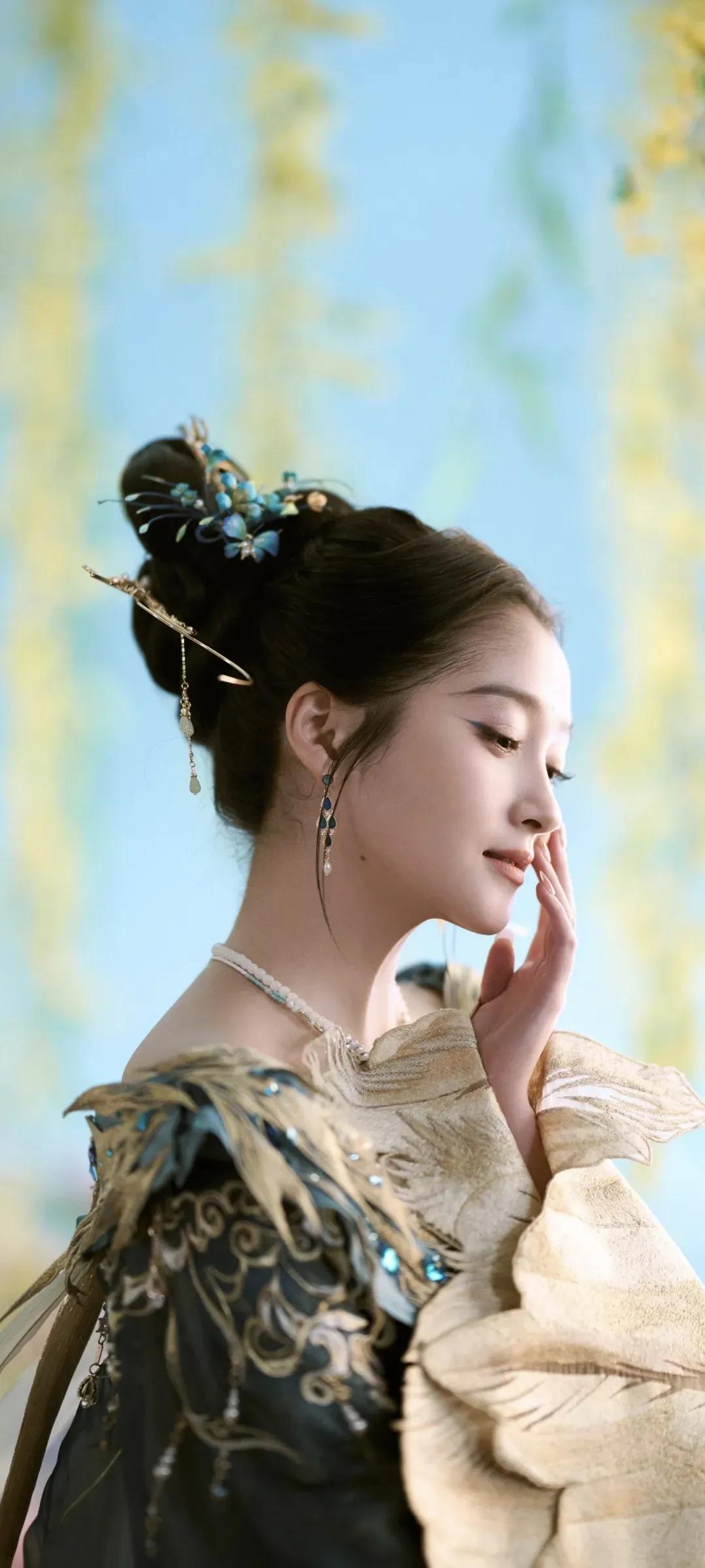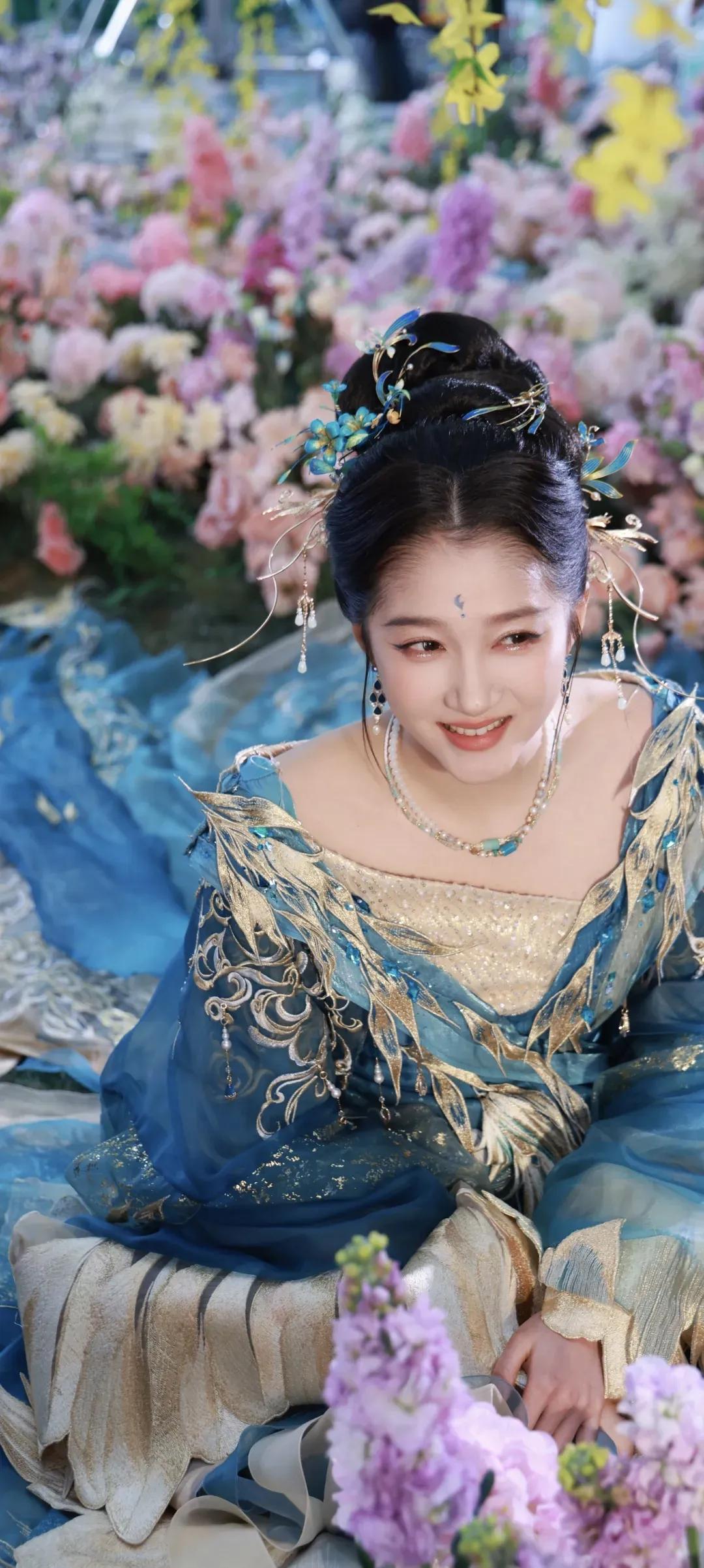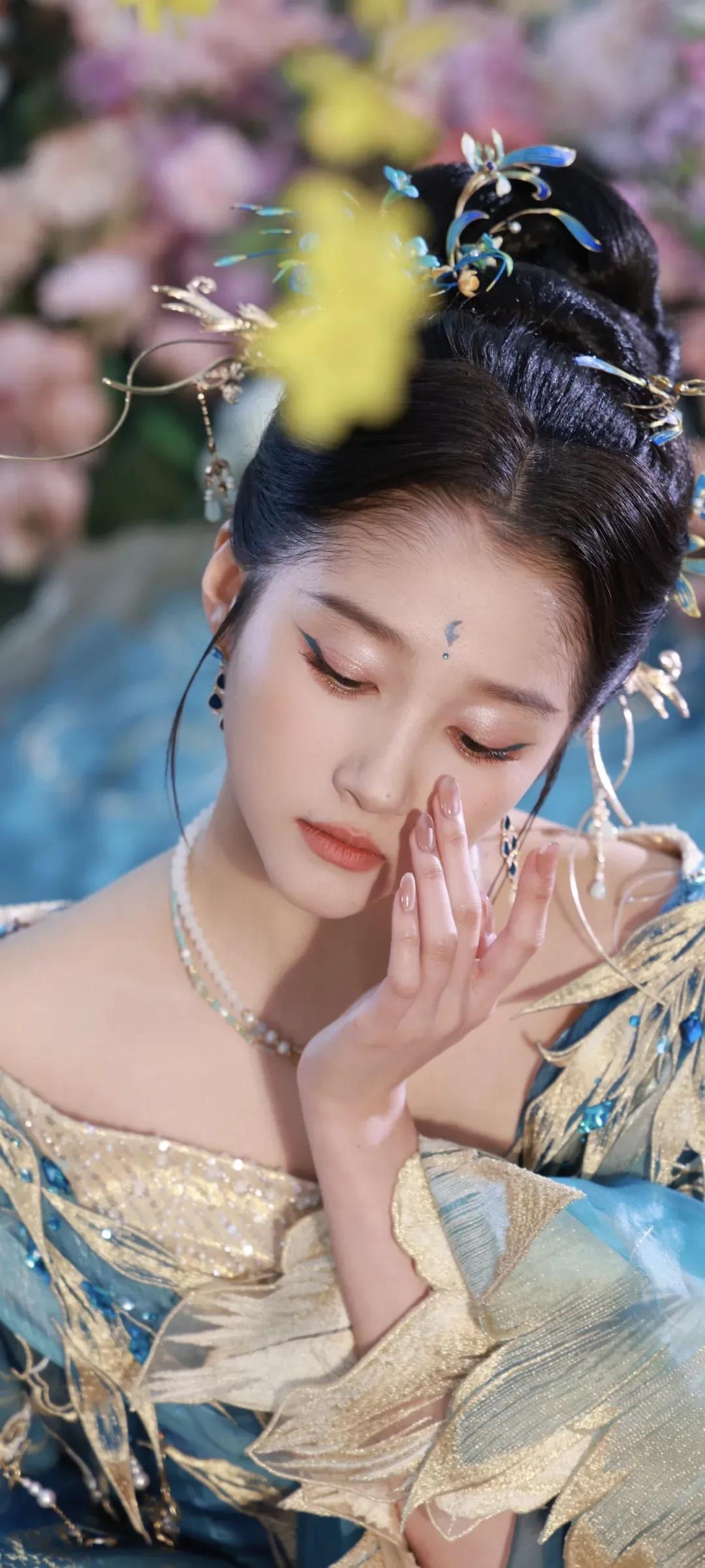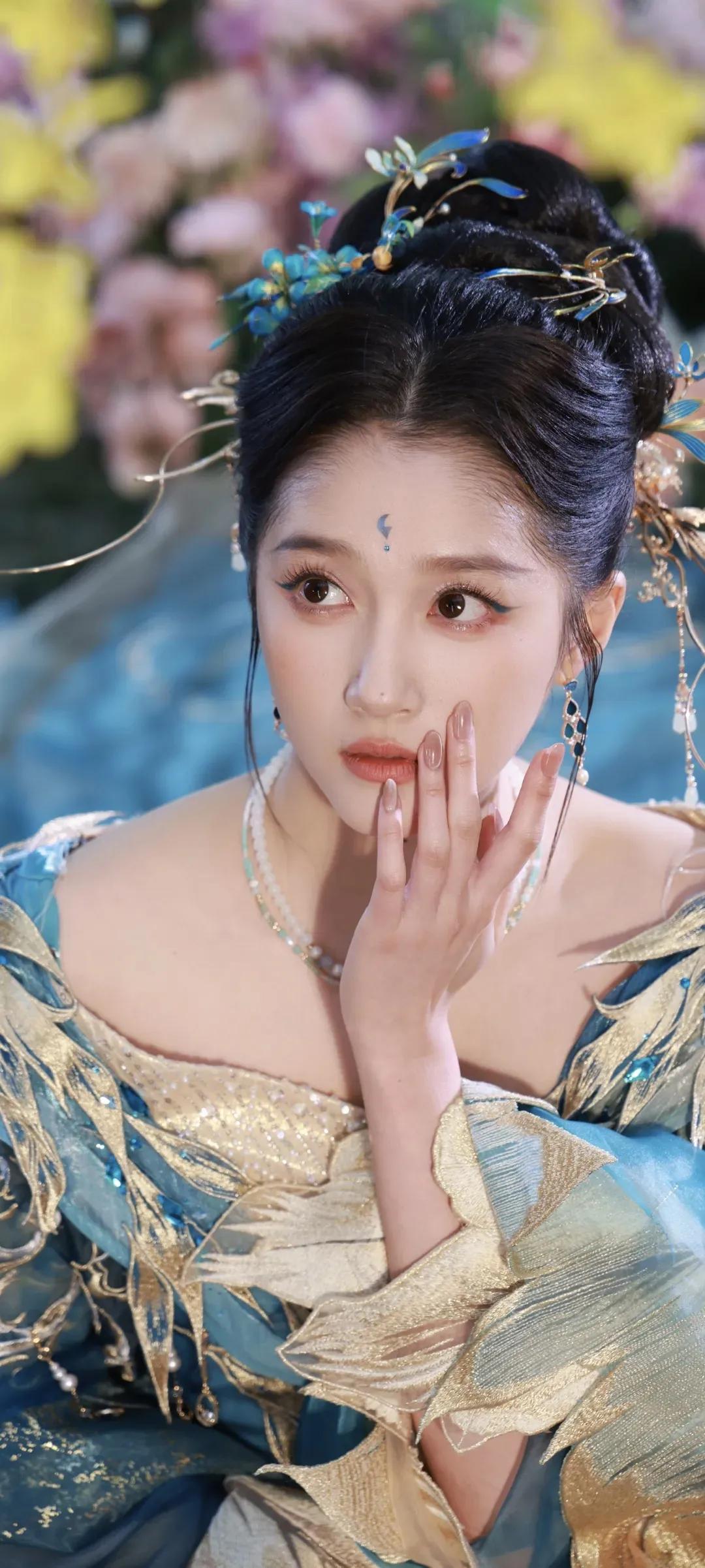 一袭蓝金交织的古风华服,绣满灵动羽纹,层叠纱幔如流云漫卷,关晓彤化身从古籍中走出的古典美人。点翠发簪缀于发间,额间花钿添了几分灵动,眉眼间是少女的明媚与古典的温婉,一抬眼、一垂眸,皆是风情。 花影簇拥间,她或抬眸浅笑,或低眉凝思,将东方美学的雅致与灵动演绎得淋漓尽致。正如她所说:“努力是为了让自己有更多选择的权利。” 这份在时光里沉淀的底气,让她在古装造型中愈发耀眼,每一个镜头都美得像一幅流动的古画。 蓝金为裳,花影为幕,是关晓彤独有的古典韵味,是一眼万年的惊鸿之美。