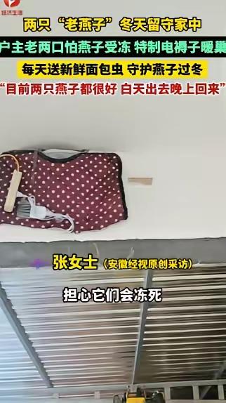 河北,两只 “老燕子” 无力南飞,留户主家过冬。没想到,户主老两口给两只燕子买了电褥子盖上,每天送新鲜面包虫给它们吃。 在河北保定那个不起眼的农家小院里,燕子窝已经存在了八年。每年春天,燕子准时归来,秋天结伴南飞,老两口早就习惯了抬头就能看到它们的身影。张女士说,她嫁过来的时候,这个窝就在了。可今年入秋后,院子里来了几十只燕子,围着这两只老家伙叽叽喳喳叫了一天,像在告别。别的燕子都飞走了,就剩这两只蹲在窝边,胸前的羽毛泛着黄,翅膀扇几下就歇了。 李大爷今年68岁,王大妈比他小两岁,儿女都在城里工作,平日里就老两口守着这栋老房子。看到燕子没走,老两口心里不是滋味。王大妈站在院子里仰头看了好几天,最后确定——这两只燕子是真的飞不动了。王大妈让城里的女儿网购了小号宠物电褥子,又找了块薄瓦片垫着,小心翼翼铺进巢里,还特意调低了温度,生怕烫伤它们。李大爷每天早上第一件事就是去花鸟市场买新鲜面包虫,用浅口小碟装着轻轻放在巢边。有次降温,电褥子断了电,王大妈半夜爬起来检查,摸着冰凉的巢穴急得直跺脚,直到重新通电、看见燕子蜷缩的身体慢慢舒展开,她才长出一口气。 懂鸟的老人告诉老两口,燕子南飞不是为了怕冷,是为了追虫子——它们只吃活虫,北方一入冬,虫子要么冻死要么钻进土里,燕子没了吃的,强行南飞只会累死在半路。老两口听完,二话没说就决定留下它们。张女士的丈夫专门买了监控摄像头,方便随时查看燕子的情况。有网友担心电褥子的线缠在一起有安全隐患,他连夜爬上去重新整理线路。后来他们还下单买了蟋蟀和玉米虫,就怕燕子吃腻了面包虫。 在河北农村,燕子登门从来不是小事。老辈人常说“燕子不进苦家门”,燕子在谁家屋檐下筑巢,谁家就人丁兴旺、和气平安。这两只燕子守了老两口八年,每年春天准时回来,秋天准时走,从没失约过。今年它们飞不动了,老两口反过来守着它们。这不是什么惊天动地的大事,可这份日复一日的惦记,比什么都贵重。一个六十八岁的老人,踩着梯子爬上爬下给燕子装电褥子,一个老太太半夜爬起来检查线路,就为了让两只鸟别冻死。 后来有人把这事发到网上,网友的评论让人鼻子发酸。有人说:“以前总听老人说‘燕子不进苦家门’,现在信了——这户人家一定很和善,燕子才赖着不走。”还有人说:“善良不分物种,你善待这个世界,这个世界也会善待你。” 这两只老燕子还能不能熬过这个冬天,谁也说不好。可至少现在,它们有一个暖和和的窝,每天都有新鲜的食物。这大概就是善良最朴素的样子——不图回报,不计得失,就是看不得一条命在自己眼前受苦。 各位读者你们怎么看?欢迎在评论区讨论。