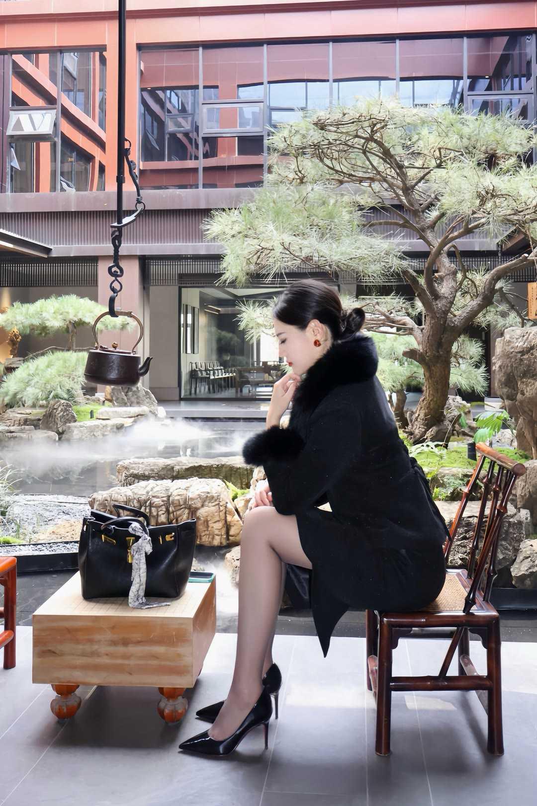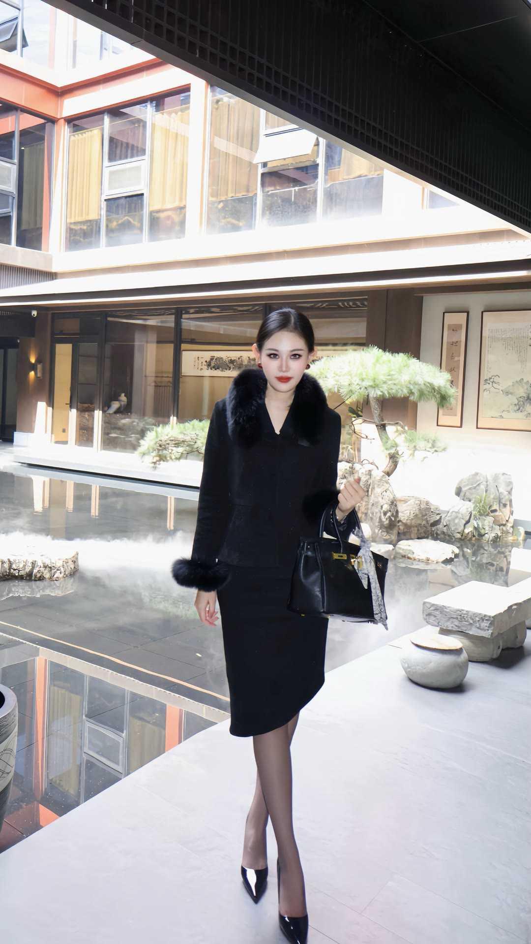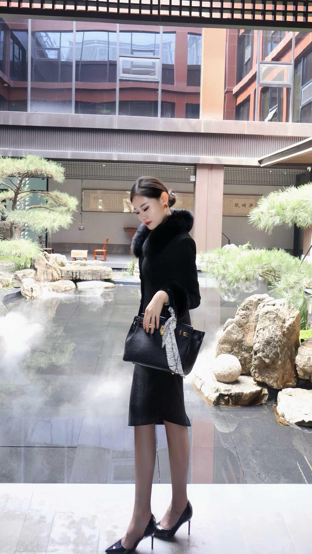 职场女性怎么穿着显得干练一身黑色毛领套装,勾勒出职场女性的利落线条。修身剪裁贴合身形,毛领点缀增添贵气,搭配同色系半裙,优雅与气场兼具。尖头高跟鞋拉长比例,手提包与丝巾细节拉满,在新中式庭院里,尽显从容干练。这套穿搭将专业感与女性魅力完美融合,是职场通勤的高级之选,每一处都彰显着成熟女性的自信与品味。