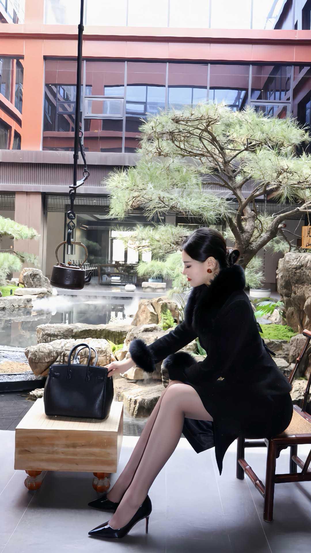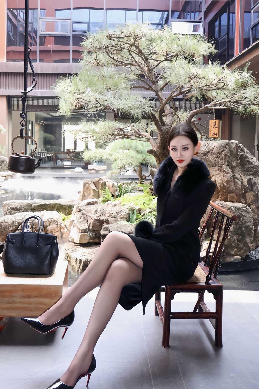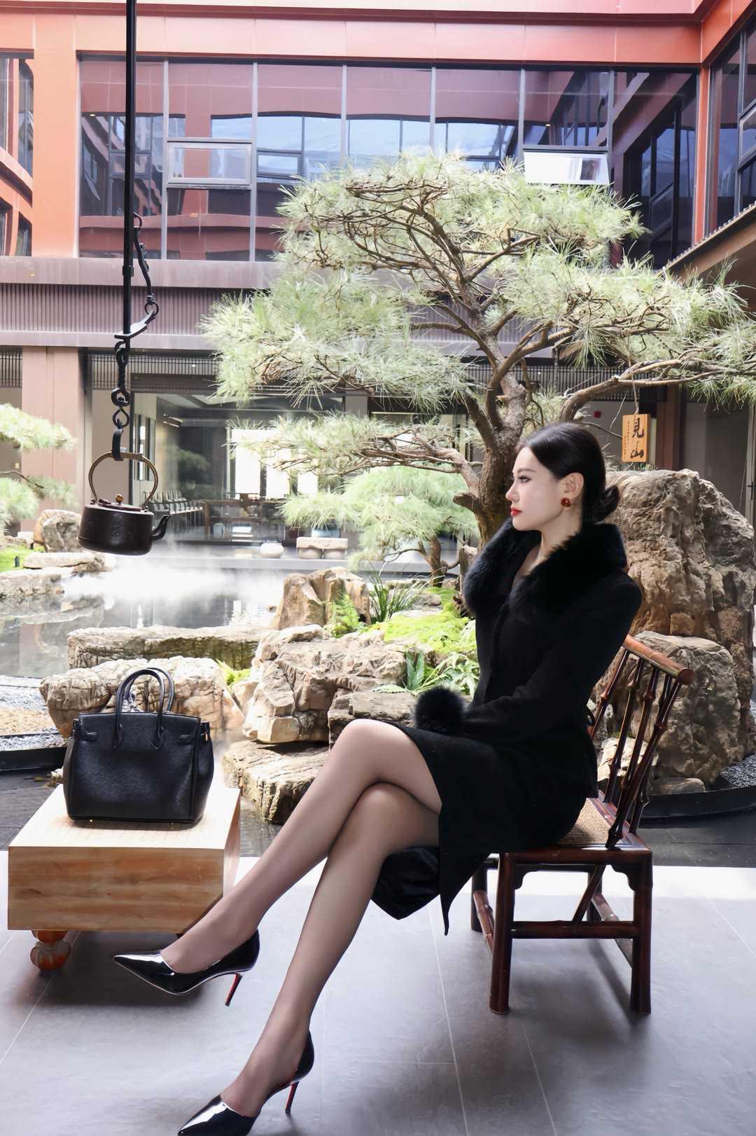 职场女性怎么穿着显得干练一身黑色毛领套装,勾勒出职场女性的利落线条。修身剪裁贴合身形,毛领点缀增添贵气,搭配同色系半裙,优雅与气场兼具。尖头高跟鞋拉长比例,手提包与丝巾细节拉满,在新中式庭院里,尽显从容干练。这套穿搭将专业感与女性魅力完美融合,是职场通勤的高级之选,每一处都彰显着成熟女性的自信与品味。