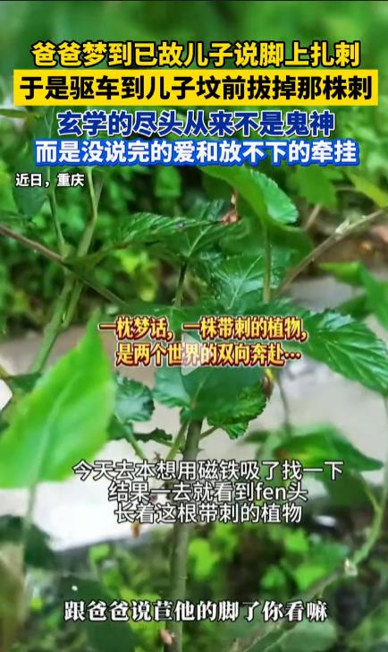 爸爸梦到已故儿子说脚上扎刺,于是驱车到儿子坟前,真发现长了一株带刺的植物,爸爸连根拔起,甩掉。玄学的尽头从来不是鬼神,而是没说完的爱和放不下的牵挂。 这哪里是巧合?是孩子用最温柔的方式,把他没说出口的疼,变成了我们能看见、能摸到的样子。 那些扎人的尖刺,是他没消散的委屈;鲜活的绿叶,是他从未离开的牵挂...... 有人说玄学的尽头是科学,可我始终相信,玄学的尽头是爱。 是刻进骨子里的思念,让两个世界有了无声的对话。 钢筋可锯,生命难续;深井易填,良心难封;刺可拔除,思念难断!