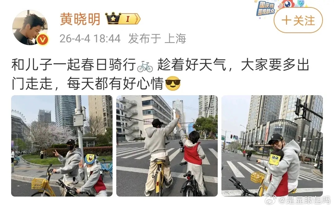 黄晓明带着儿子春日骑行,9岁小海绵留帅气发型!父子同框超有爱!