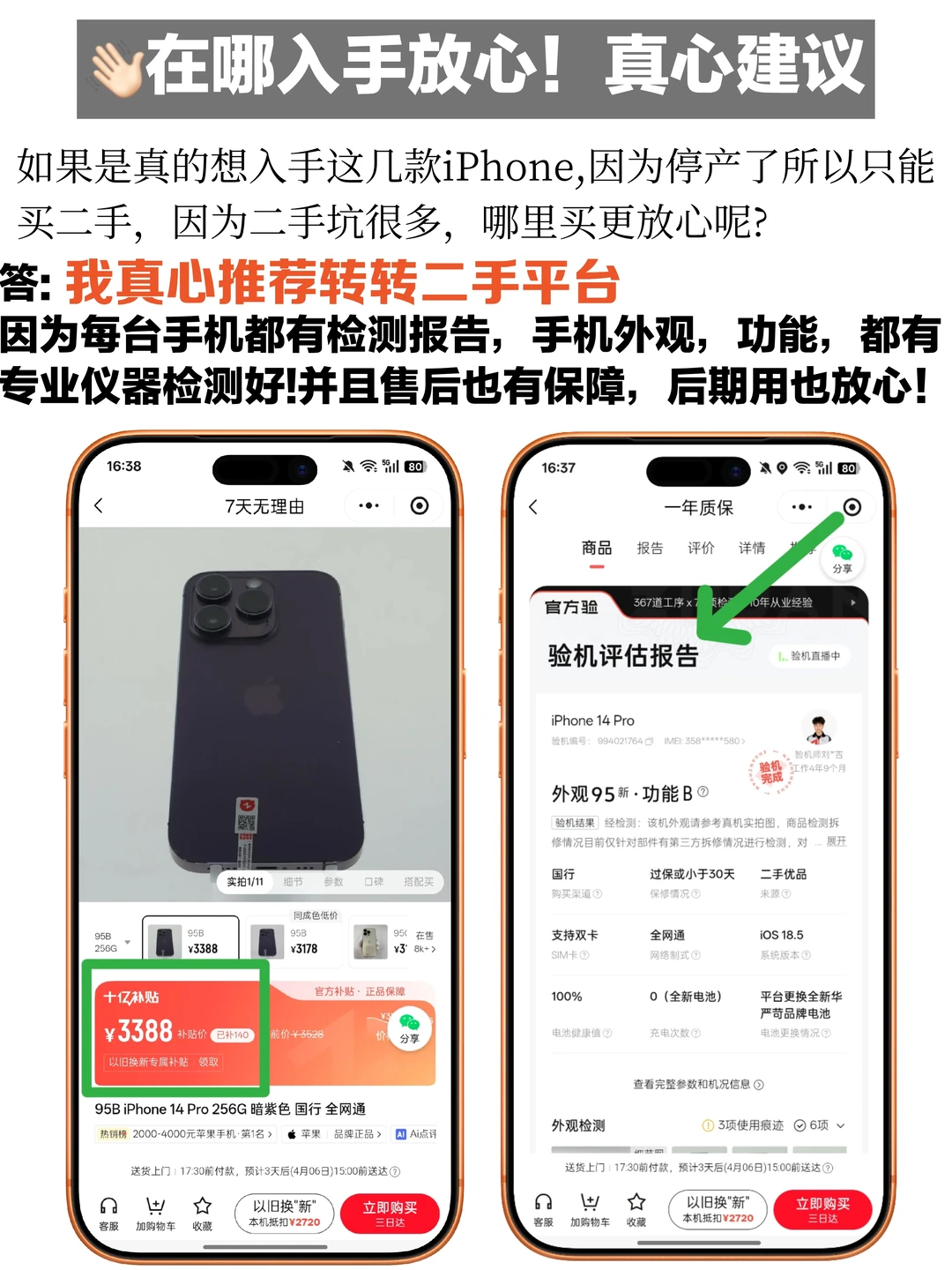 1. 渠道与验机:优先选择官方认证平台(如转转APP)因为转转每一台手机都有验机报告,到手后几乎不用自己检查一遍,并且支持7天无理由和一年质保,适合小白