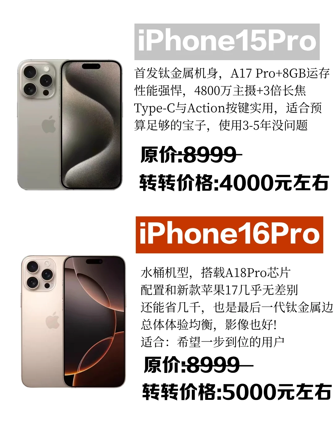 理由:水桶机型,搭载A18Pro芯片,在使用5年完全没问题,配置和新款苹果17几乎无差别,还能省几千,也是最后一代钛金属边框