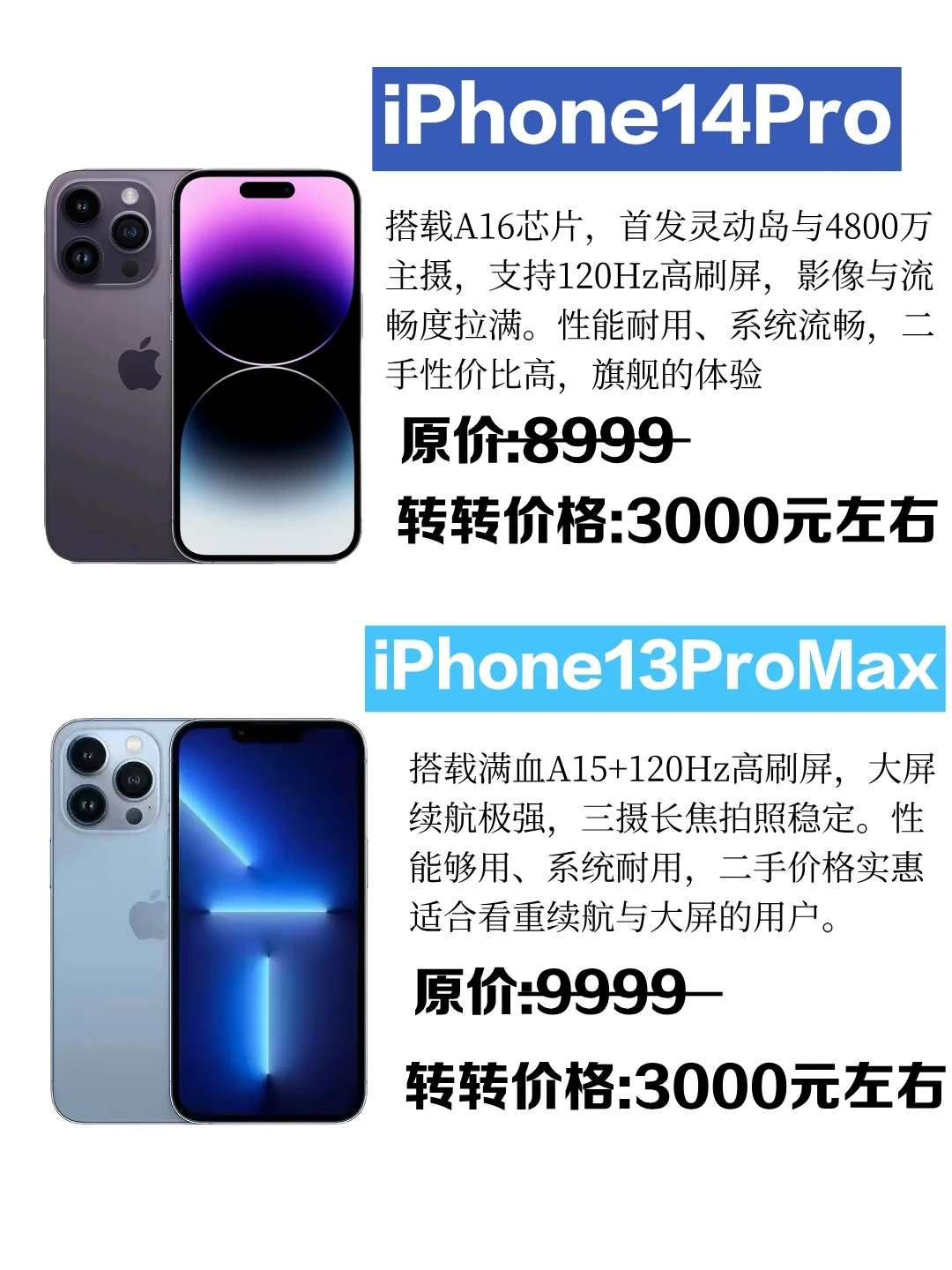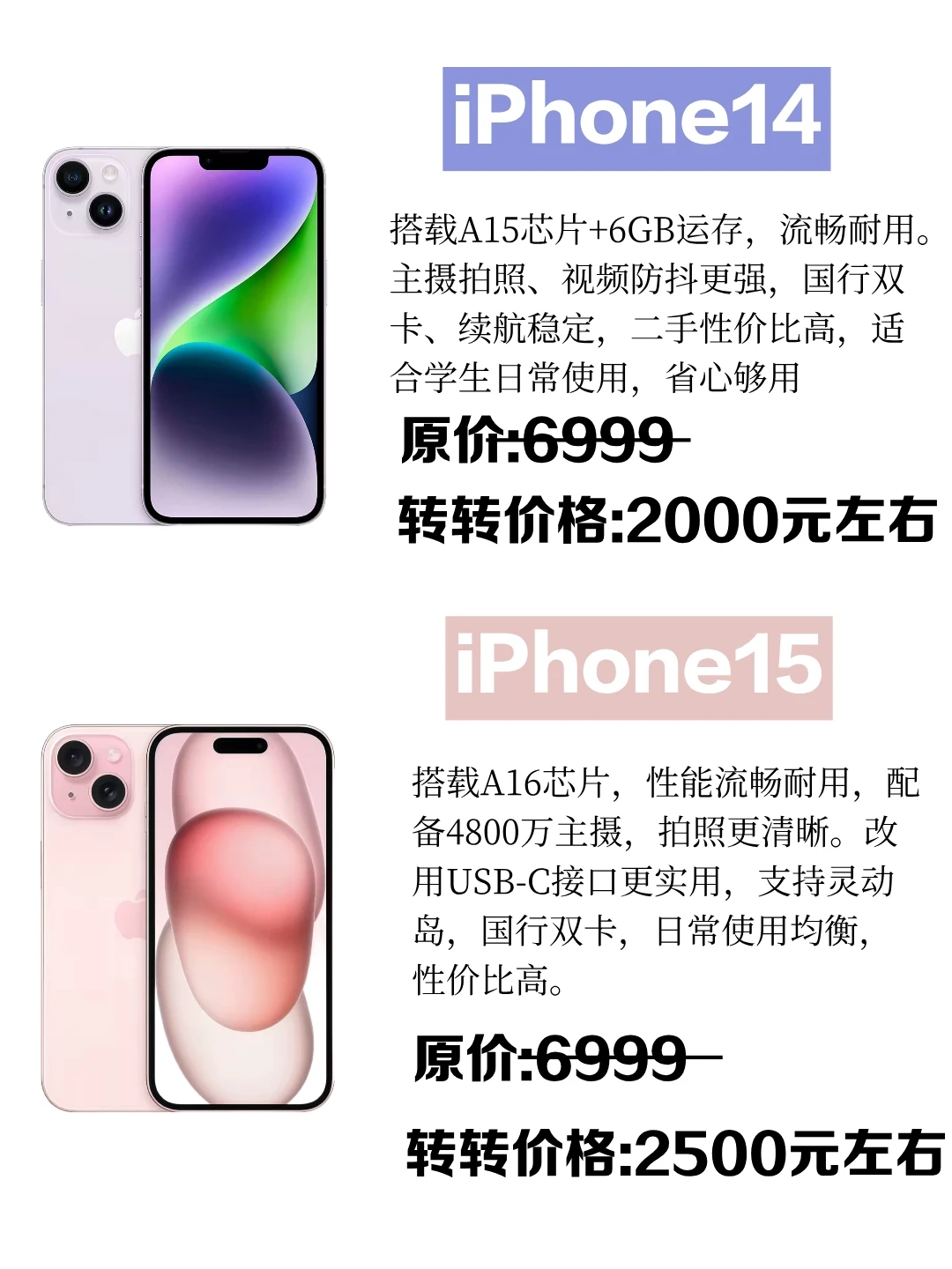 理由:二手市场“性价比之王”。A15芯片性能依旧够用,支持5G和IP68防水。相比13,主摄加入传感器位移防抖,续航也更强。适合作为备用机、学生机或给长辈使用。