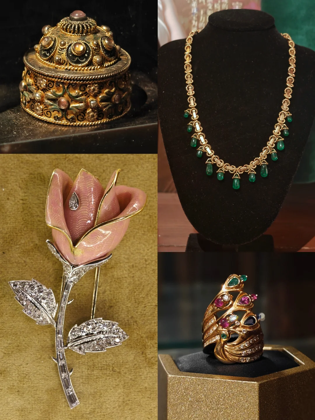 ✨和传统博物馆式展览不同,这个展览最大的亮点在于允许观众零距离触摸展品。各个历史阶段的冠冕、项链、胸针、珐琅等孤品(有不少还是顶级品),不但可以不用隔着玻璃而是超近距离仔细观看正反里外每个细节,还都可亲手触摸,通过指尖直接感受百年工艺的细腻与精湛。