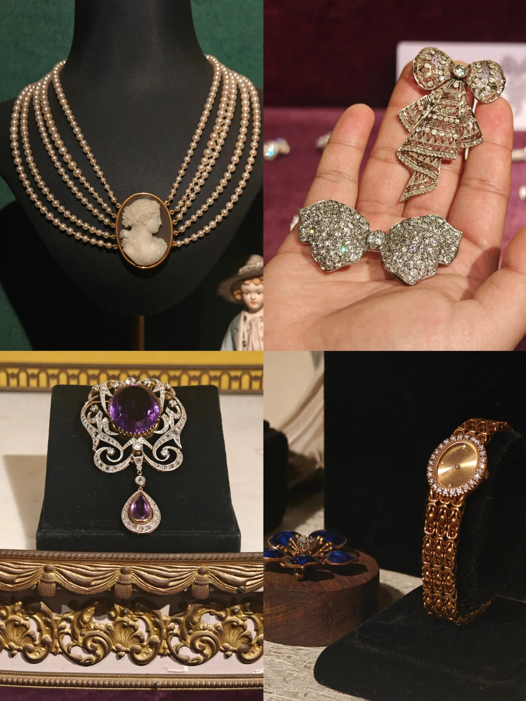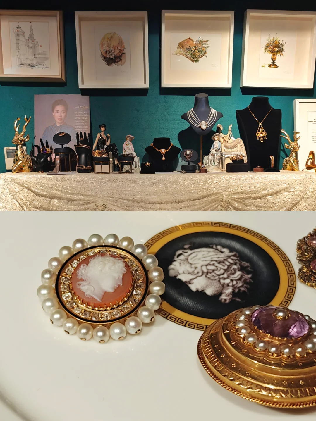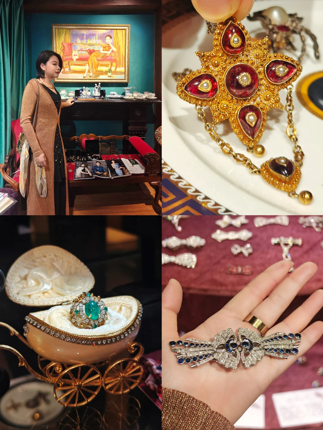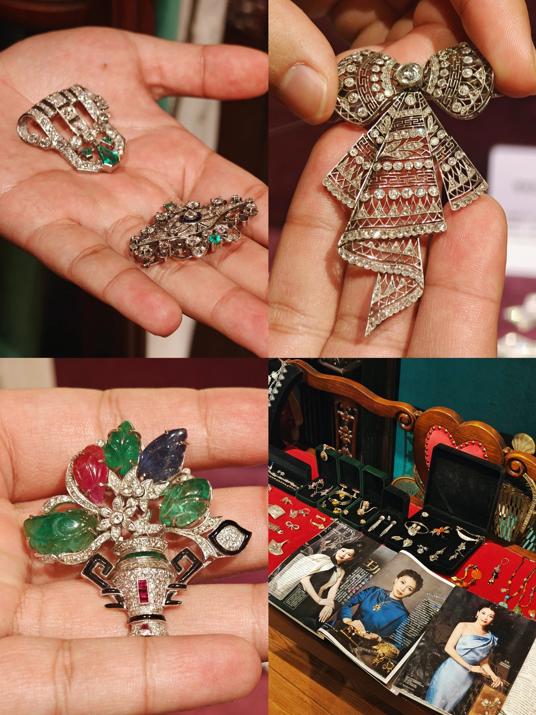 🏛️其实这次观展经历,更像是去收藏着这些珠宝的女主人家做客,有“管家”全程一对一的讲解,珠宝也陈列在有生活气息的古董玻璃酒柜中,营造出相得益彰的历史氛围。这里很像欧洲巷子里的宝藏古董店,一楼售卖海派古董家具、首饰和古典服饰,一楼的楼梯口和二楼为展览区域,买票参观的客人还有个福利是可以随意拍照,包括一楼普通客人不可以拍照的部分。