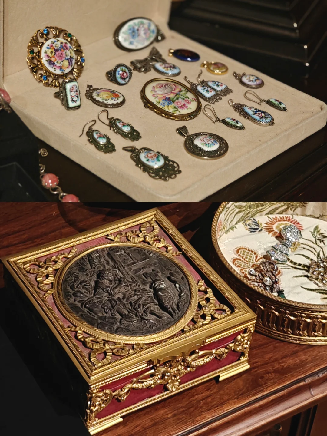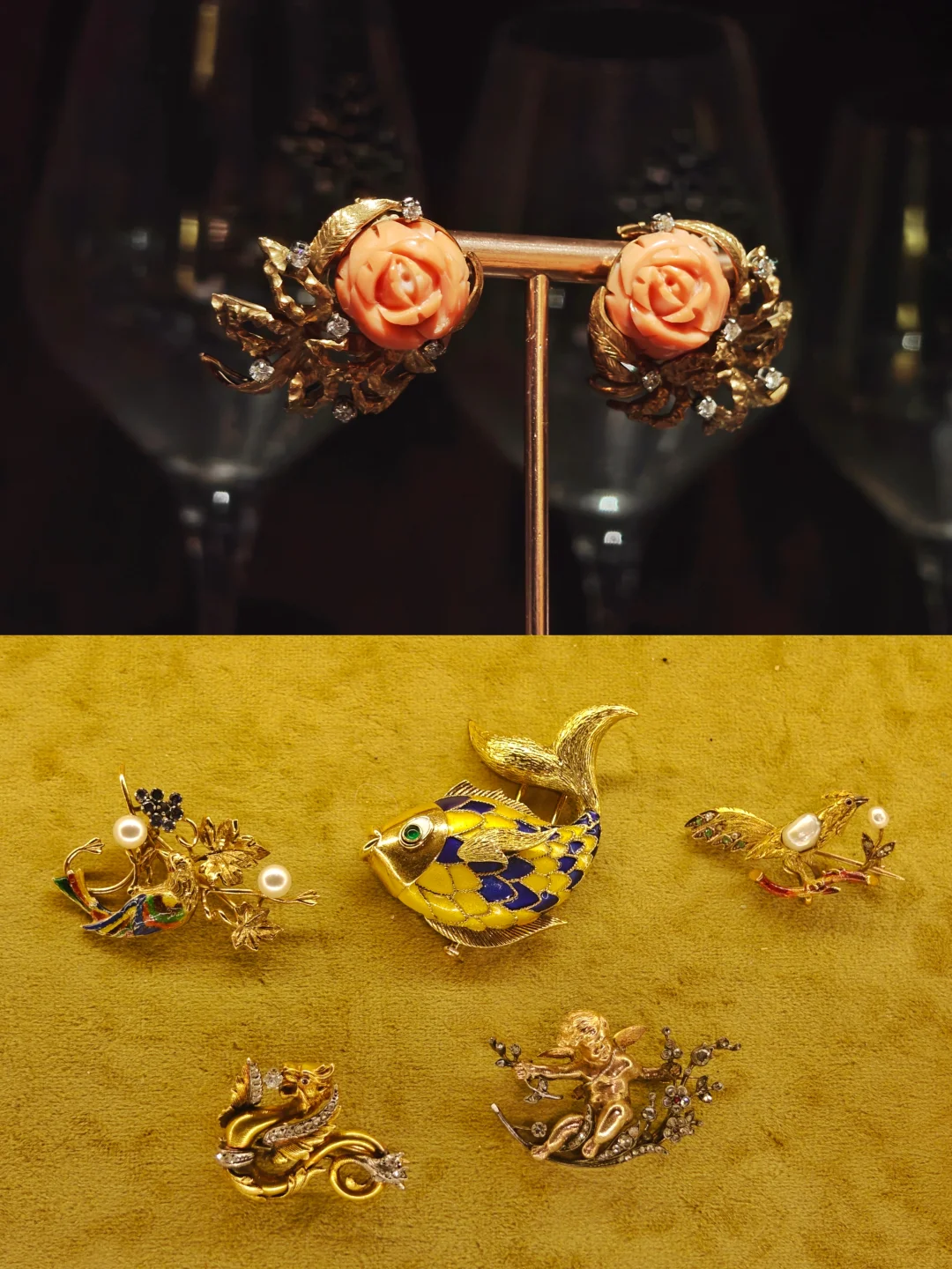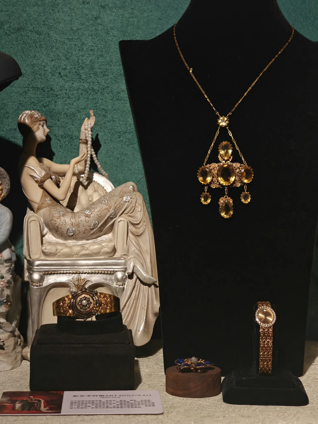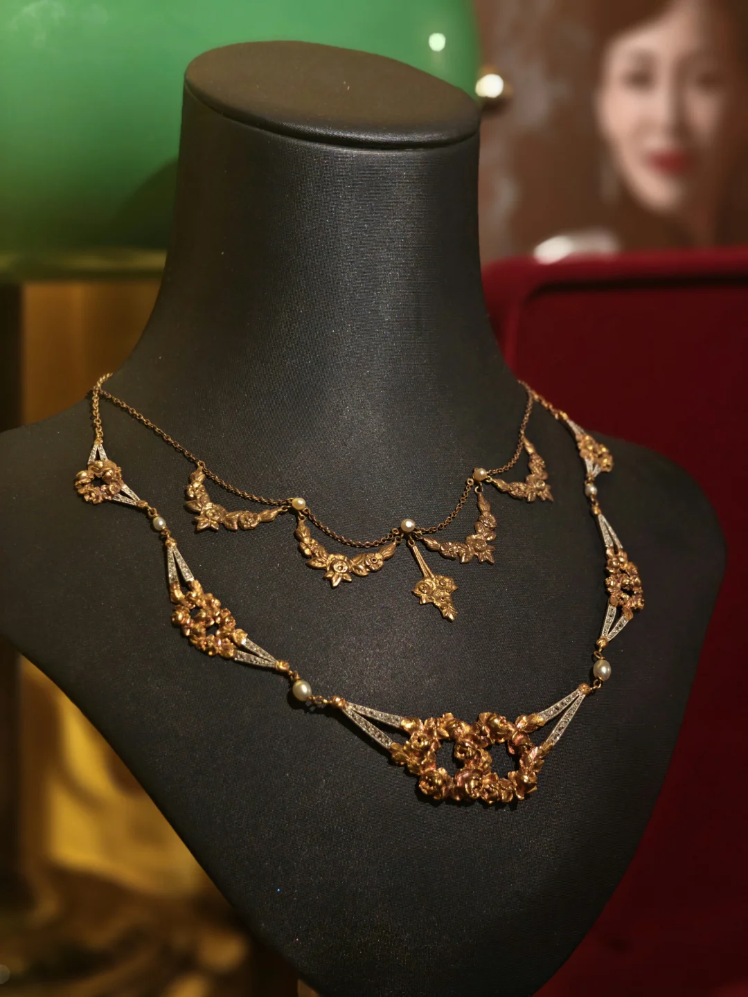 🏛️其实这次观展经历,更像是去收藏着这些珠宝的女主人家做客,有“管家”全程一对一的讲解,珠宝也陈列在有生活气息的古董玻璃酒柜中,营造出相得益彰的历史氛围。这里很像欧洲巷子里的宝藏古董店,一楼售卖海派古董家具、首饰和古典服饰,一楼的楼梯口和二楼为展览区域,买票参观的客人还有个福利是可以随意拍照,包括一楼普通客人不可以拍照的部分。