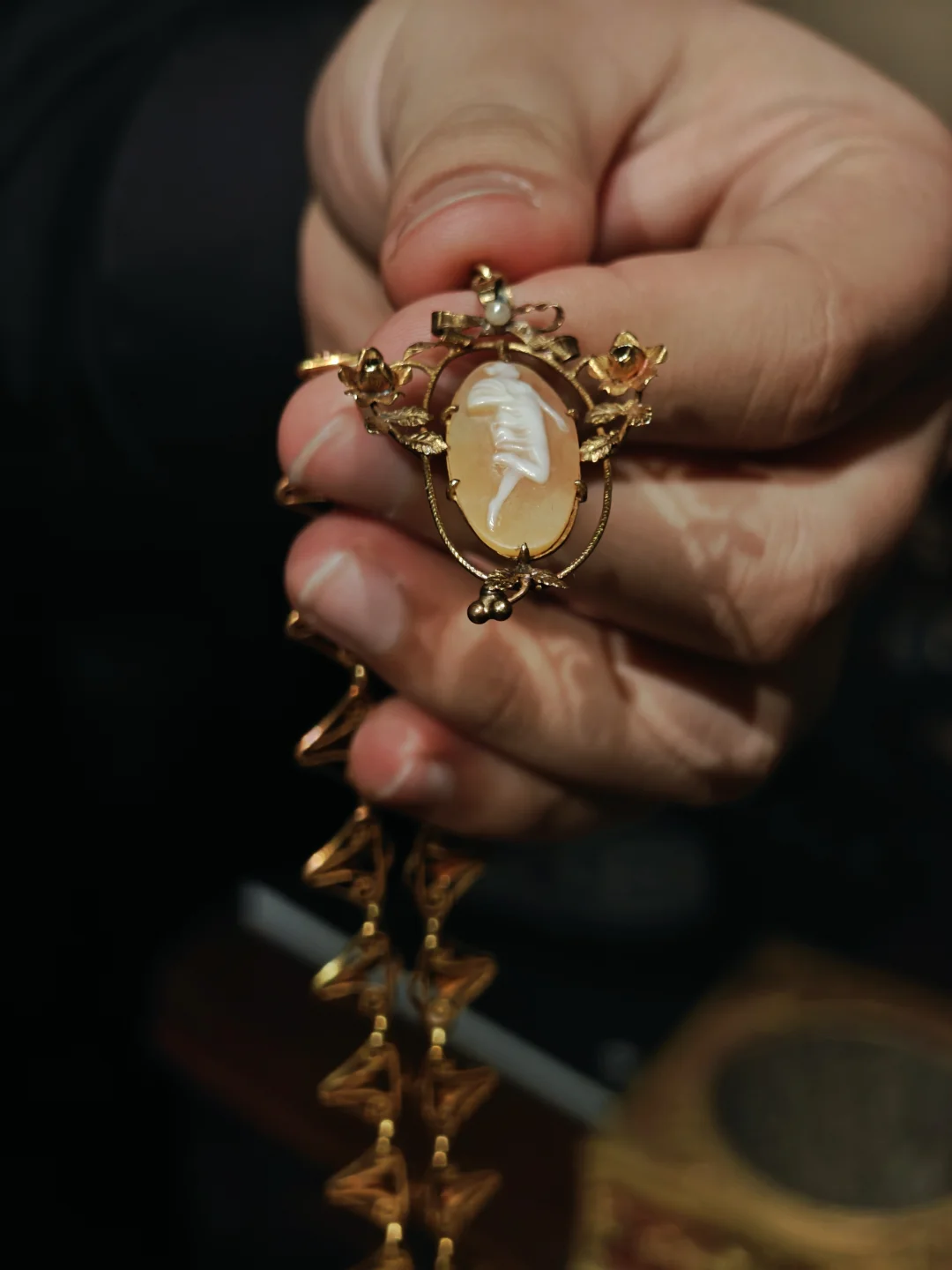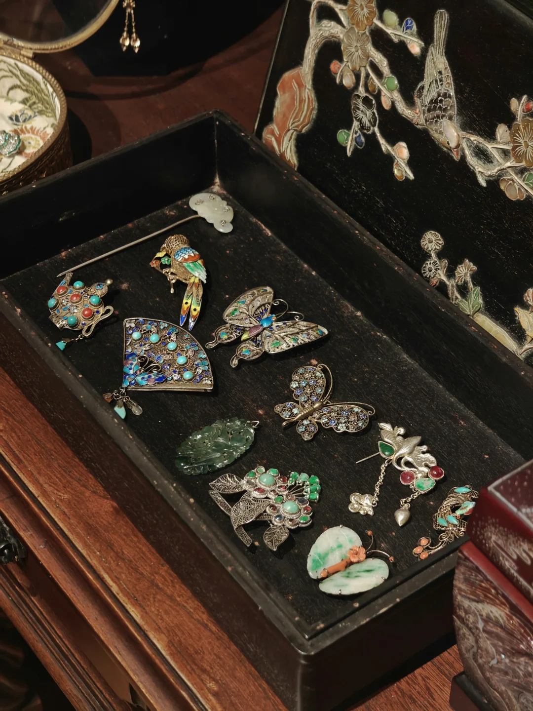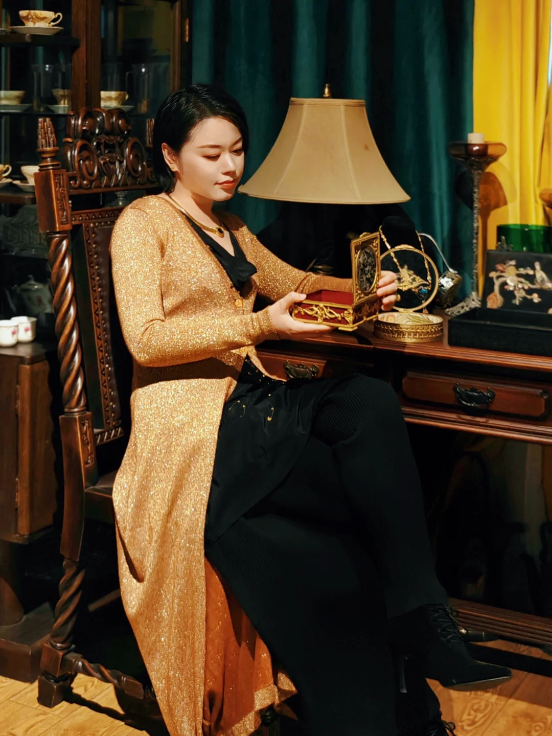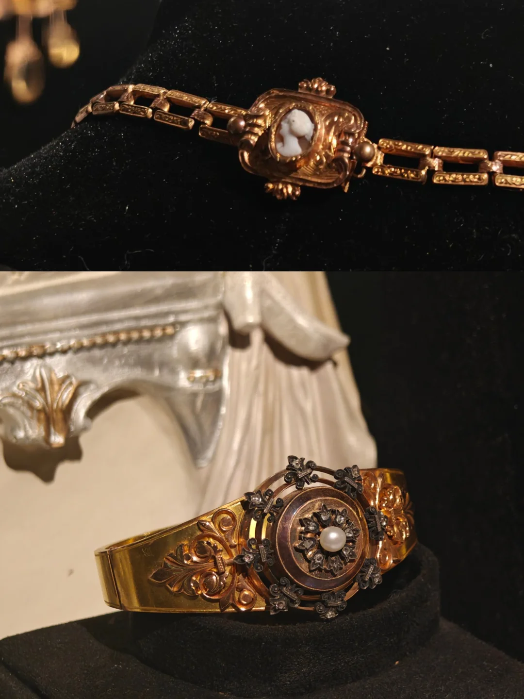 🏛️其实这次观展经历,更像是去收藏着这些珠宝的女主人家做客,有“管家”全程一对一的讲解,珠宝也陈列在有生活气息的古董玻璃酒柜中,营造出相得益彰的历史氛围。这里很像欧洲巷子里的宝藏古董店,一楼售卖海派古董家具、首饰和古典服饰,一楼的楼梯口和二楼为展览区域,买票参观的客人还有个福利是可以随意拍照,包括一楼普通客人不可以拍照的部分。