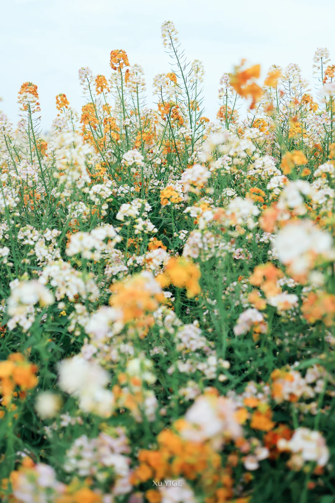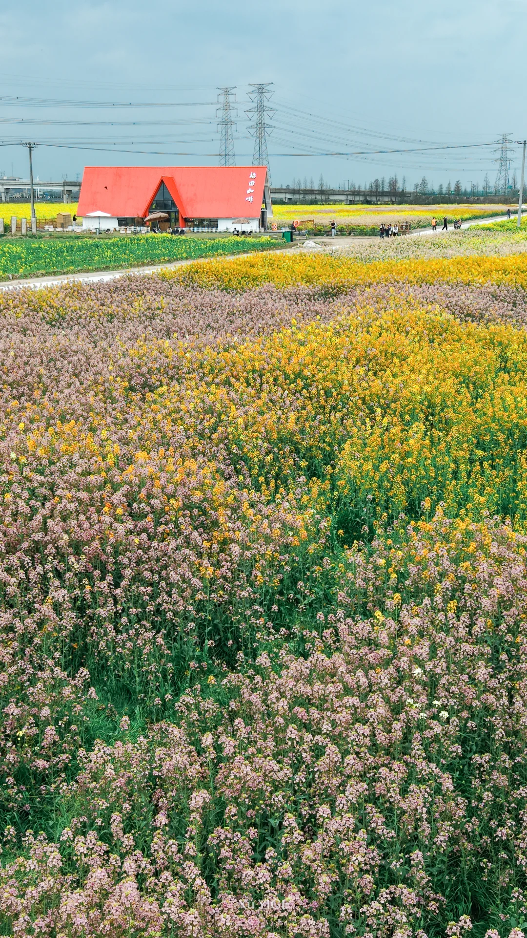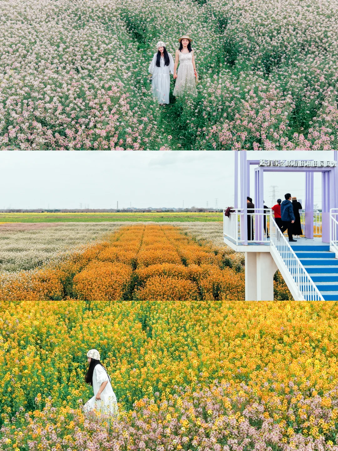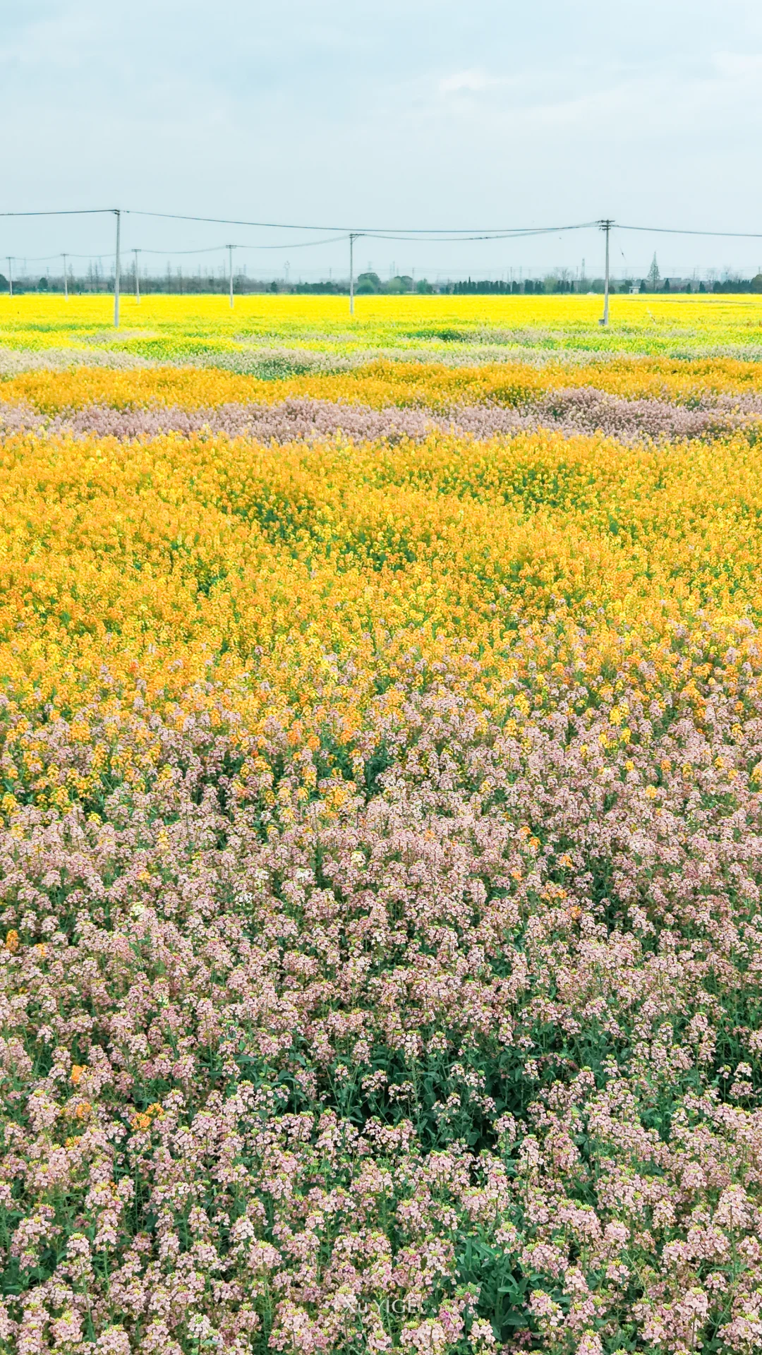 百亩彩色油菜花田正盛,金黄、雪白、柔粉、橙霞、淡紫交织,像打翻了彩虹调色盘,随手一拍都是自带滤镜的春日大片📸