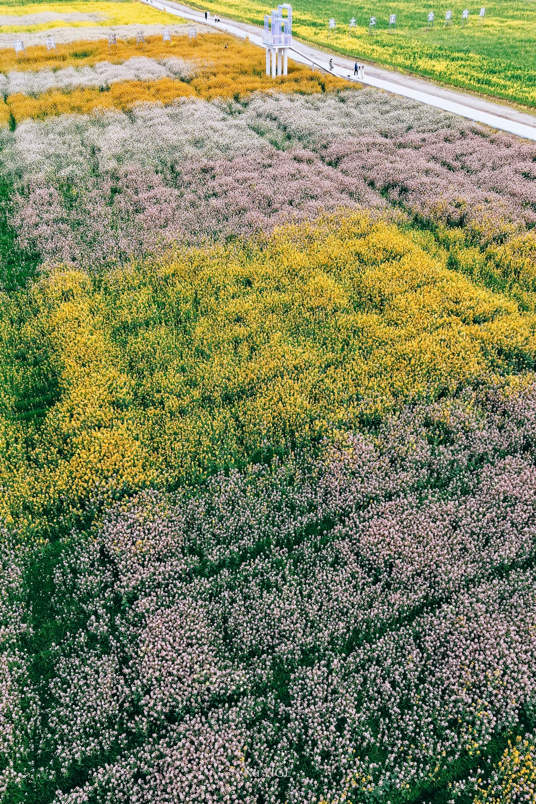·七彩花田超震撼,各色油菜花错落成大地艺术,航拍视角更是绝美