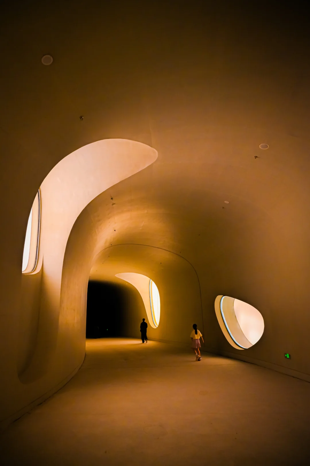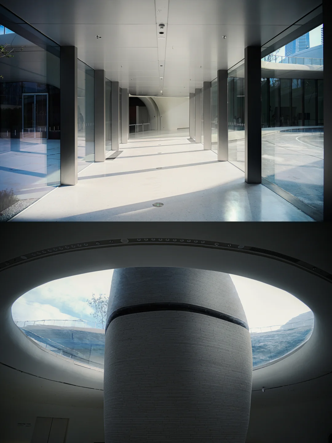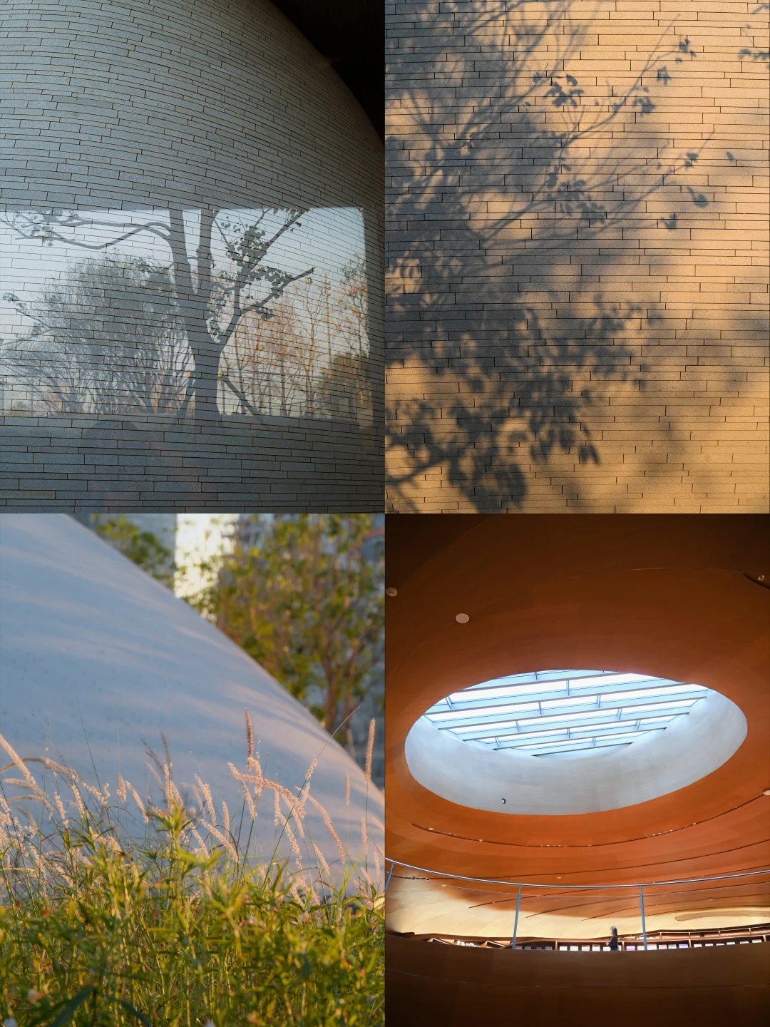 衔接城市与人才公园的隧道被塑造成一个充满未来感的虫洞空间,还有穹顶上洒下来的天光、投射在墙面上的植物影子也很美丽。