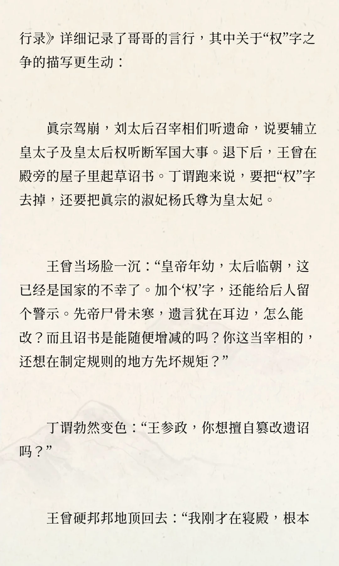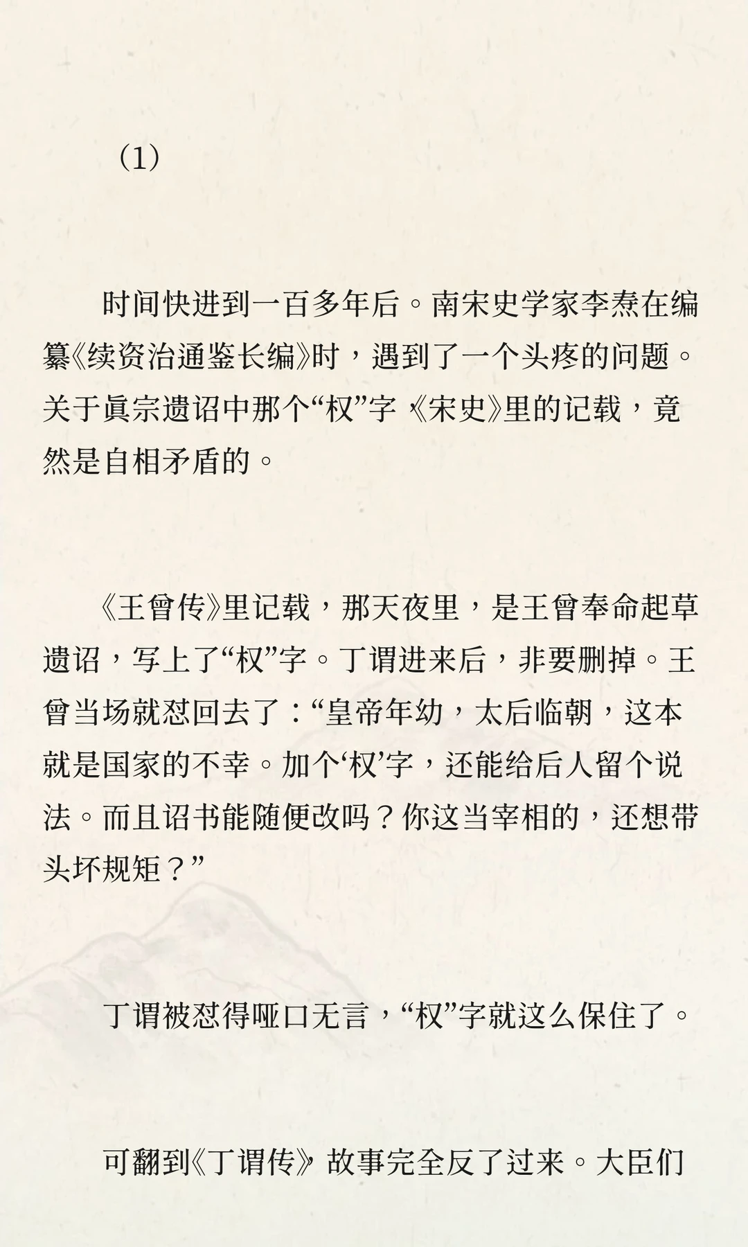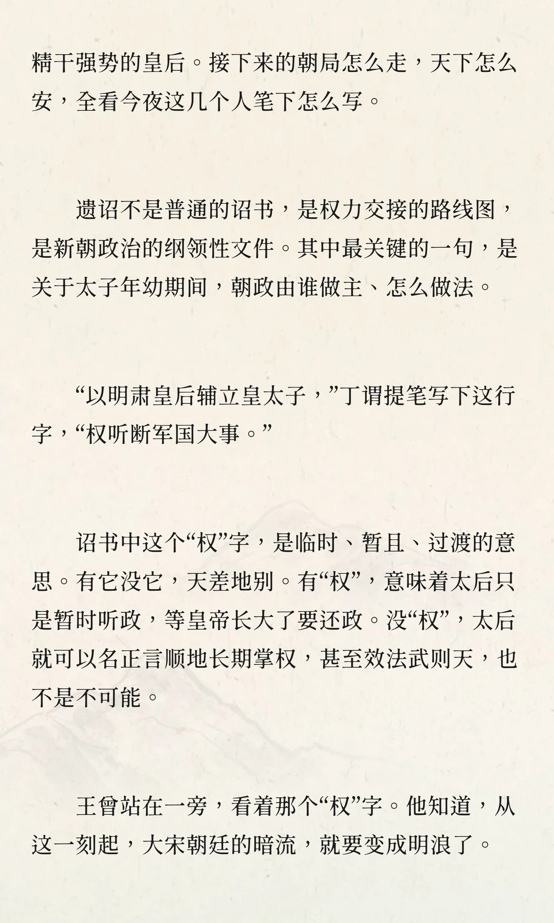 宋真宗病逝,遗诏中“权”字争议引发朝局变局。最终太后垂帘听政十一年,虽未完全限制其权力,但“权”字成为未来政治斗争的先例。
