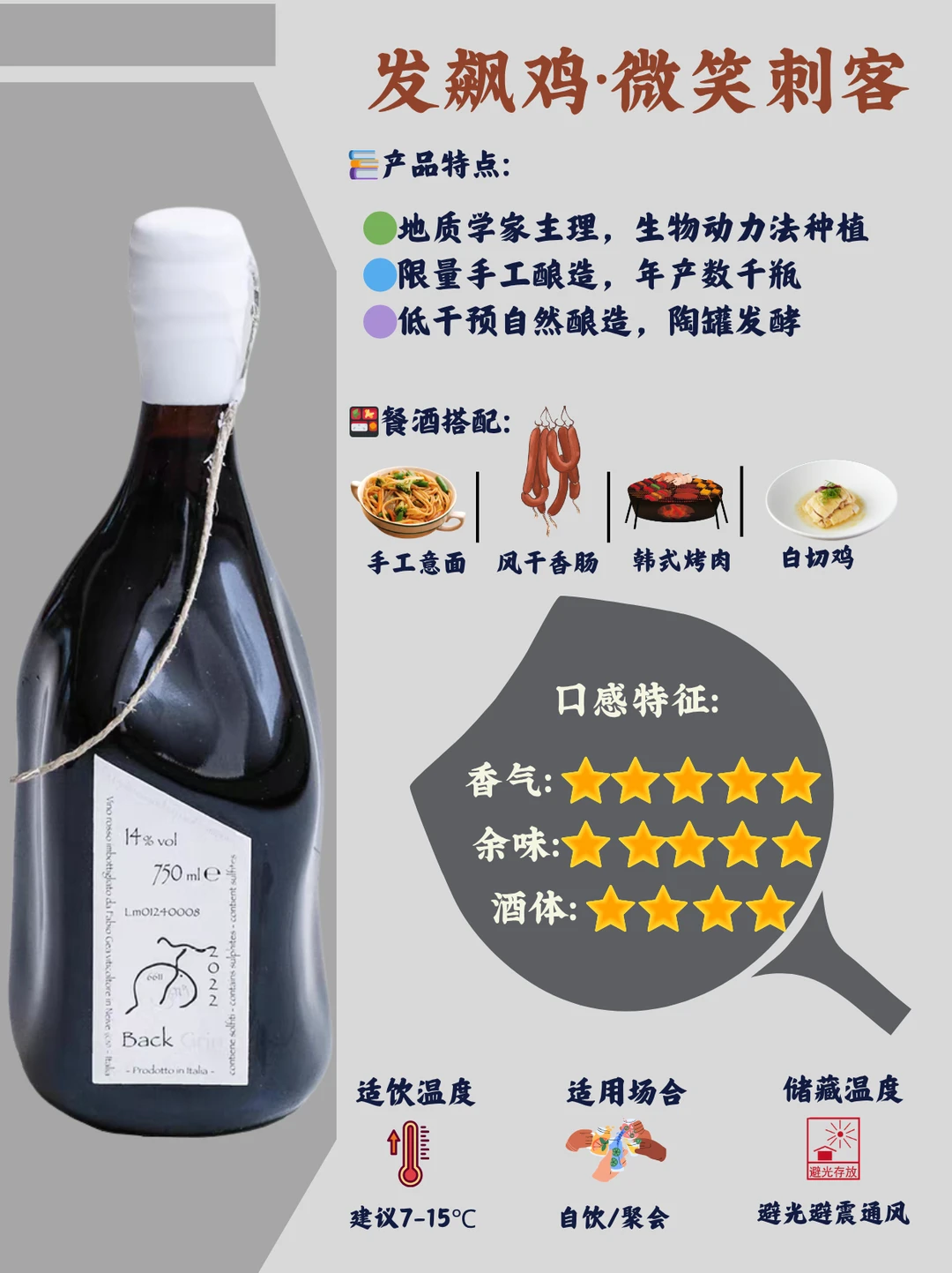 余味干净悠长,红果清甜混着矿物回甘,完美诠释自然酒的优雅生命力