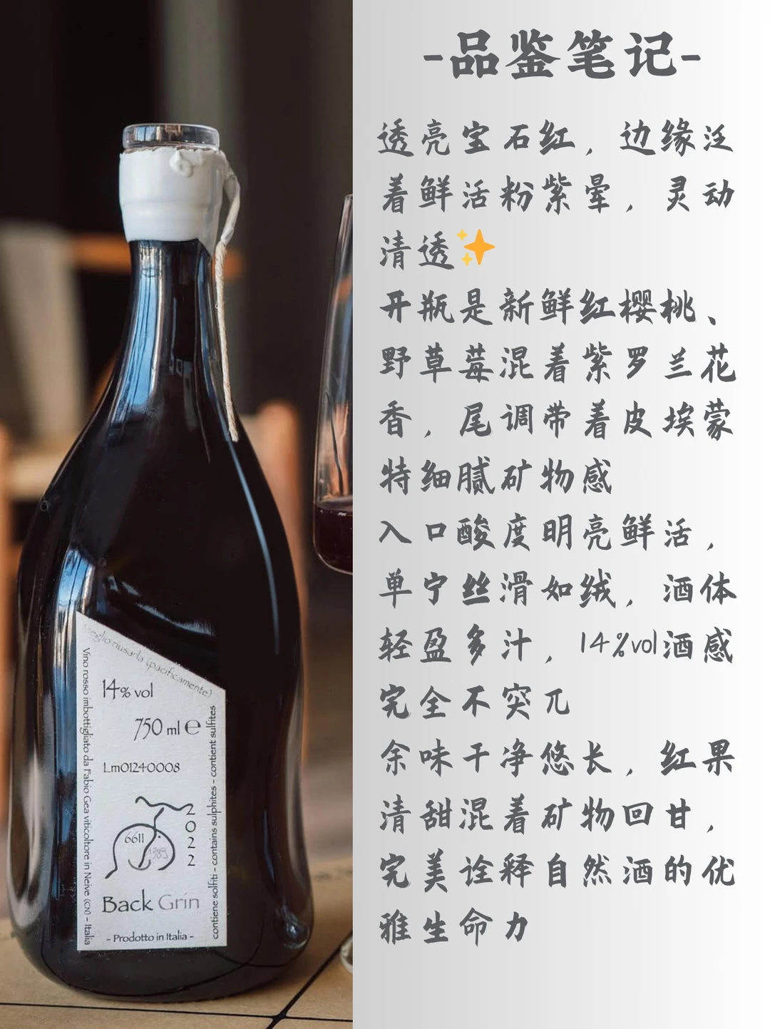 入口酸度明亮鲜活,单宁丝滑如绒,酒体轻盈多汁,14%vol酒感完全不突兀