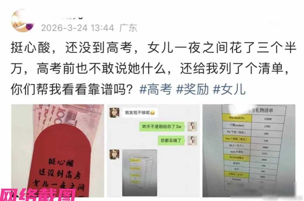 有一地的学校在高考百天誓师后,一名高三女生没有再接再厉做好高考的复习与练题,而是给自己的爸妈开出了心愿单,写明自己需要的东西。 面对女生开出的东西价值也靠近三万多元,清单里全是女生渴望的生活美好目标,爸妈没有发懵,而且对女儿这样的行为有点奇怪,没有把心事放在学习备考上,且先把心思用在自己的欲望之中,以后的高考能不能行,如今看来真得难说,估计女生的爸妈虽然嘴上没有说什么,但心里有了无奈。 我们可以理解女生的想法,希望自己高考后能够让自己的生活变得惬意,但不知高考在两个月之后,如今先提出自己的欲望,却没有自己对于高考态度的想法,这心看样子已经不在高考上,开始想着自己需要的享受了。 这里有了女生爸妈无法做出的选择,但她们希望女生把自己的心思放在备考上,不要提前消费自己的欲望,这里女生没有摆正好自己的位置,拿高考当做自己的一次交换与收获,看样子女生自己对高考成绩也没有那么在乎。 这里有家儿女的无奈,也有父母对待孩子的尴尬,唯有一声叹息有了苦笑。