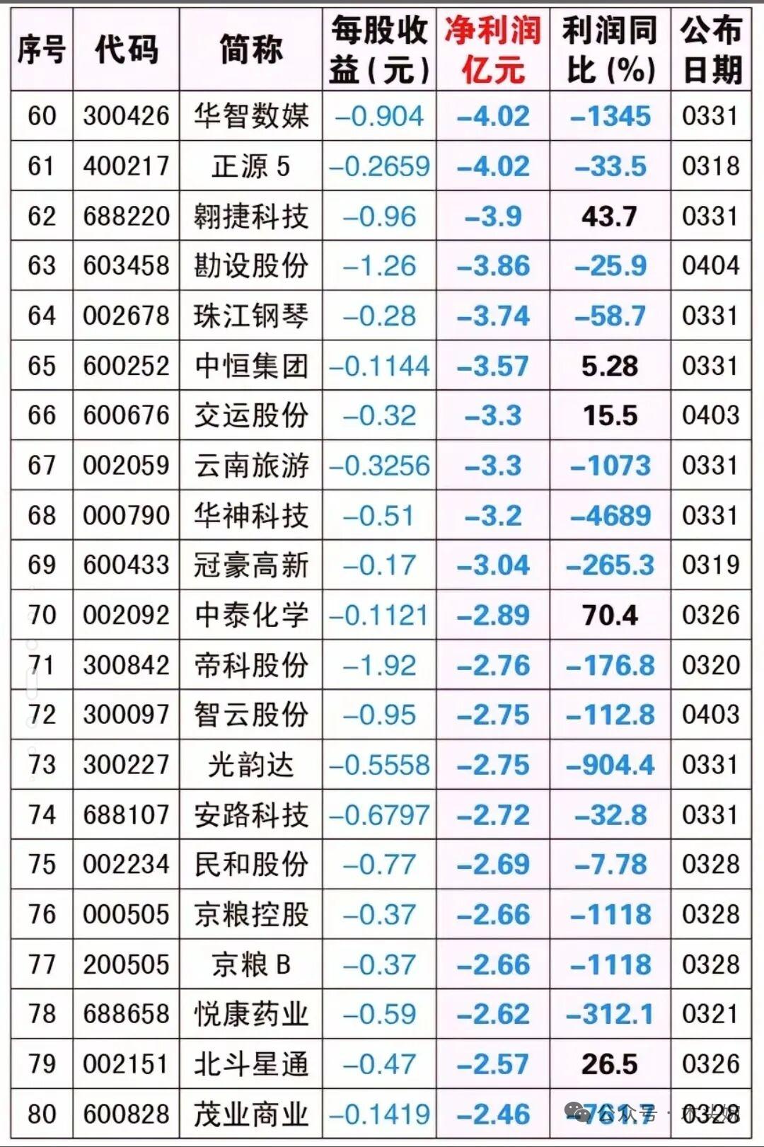 2025年年报巨亏榜出炉!这些公司亏到“离谱”! 截至4月4日的2025年年报亏损排行榜出炉,万科A以-885.56亿元的巨额亏损位居榜首,美凯龙、华侨城A等昔日行业龙头也深陷亏损泥潭。这不仅是冰冷的财务数字,更直观揭示了房地产、传统制造等行业在周期下行与转型阵痛中的艰难处境。 值得注意的是,业绩与股价走势并非简单的线性关系。部分公司如世茂集团、TCL中环虽业绩承压,但净利润同比微增,展现出一定韧性,股价或已提前反应悲观预期;而一些亏损幅度扩大的公司,其股价可能因市场对行业前景的担忧而持续承压。 投资路上,避雷永远是第一位,这份亏损名单请务必收好,远离业绩雷区!年报严重亏损往往预示着公司基本面恶化,可能引发股价进一步下跌风险。不得不防…… 风险提示: 本榜单仅为业绩数据展示,不构成任何投资建议。投资有风险,入市需谨慎。投资者应充分评估自身风险承受能力,关注公司基本面变化及行业政策走向,切勿盲目跟风。
